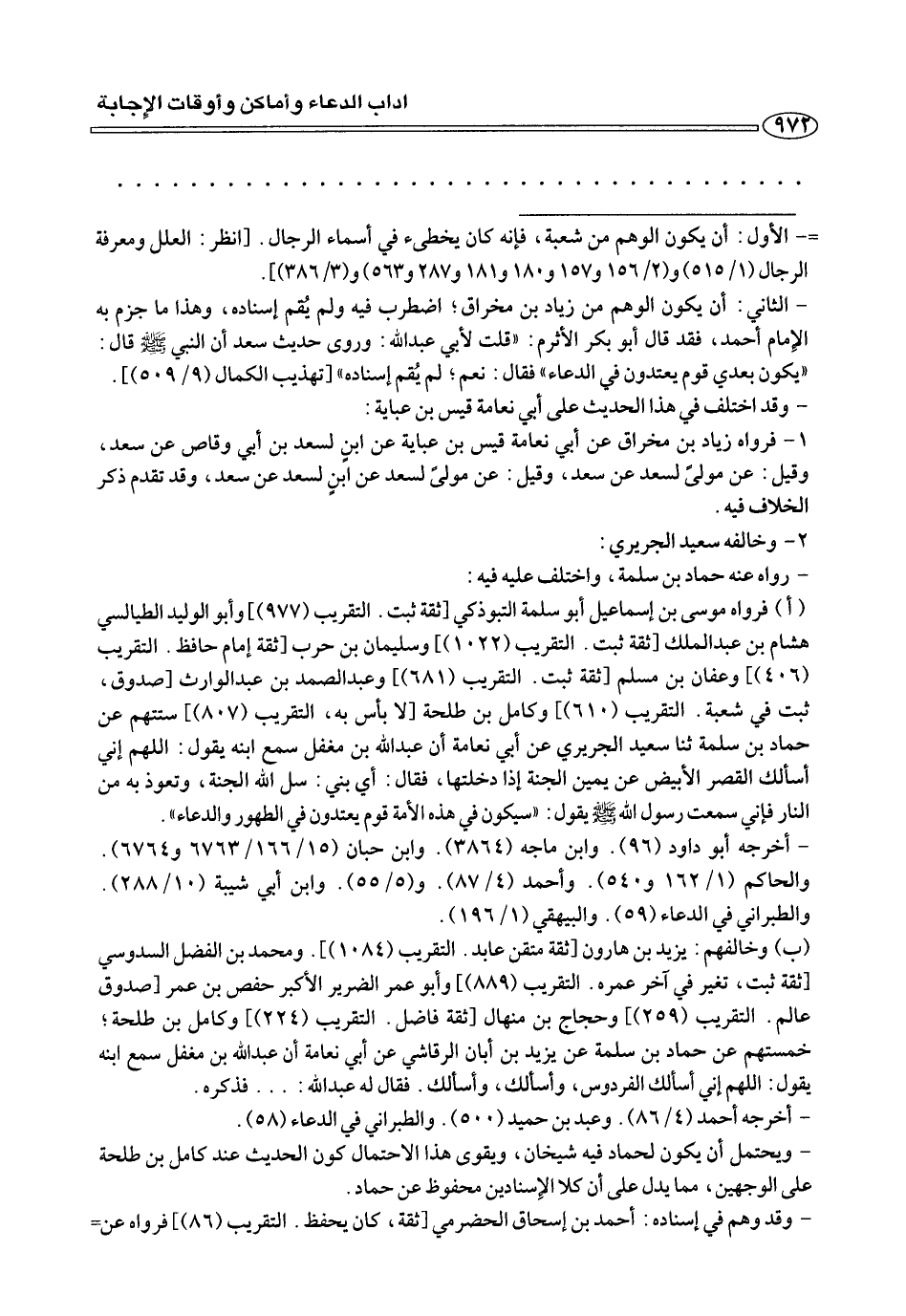 (أ) فرواه موسى بن إسماعيل أبو سلمة التبوذكي [ثقة ثبت. التقريب (٩٧٧) وأبو الوليد الطيالسي هشام بن عبد الملك [ثقة ثبت. التقريب (١٠٢٢) وسليمان بن حرب [ثقة إمام حافظ. التقريب (٤٠٦)] وعفان بن مسلم [ثقة ثبت. التقريب (٦٨١)] وعبد الصمد بن عبد الوارث [صدوق، ثبت في شعبة. التقريب (٦١٠)] وكامل بن طلحة [لا بأس به، التقريب (٨٠٧)] ستتهم عن حماد بن سلمة ثنا سعيد الجريري عن أبي نعامة أن عبد الله بن مغفل سمع ابنه يقول: اللهم إني أسألك القصر الأبيض عن يمين الجنة إذا دخلتها، فقال: أي بني: سل الله الجنة، وتعوذ به من النار فإني سمعت رسول الله صلى الله عليه وسلم يقول: «سيكون في هذه الأمة قوم يعتدون في الطهور والدعاء».