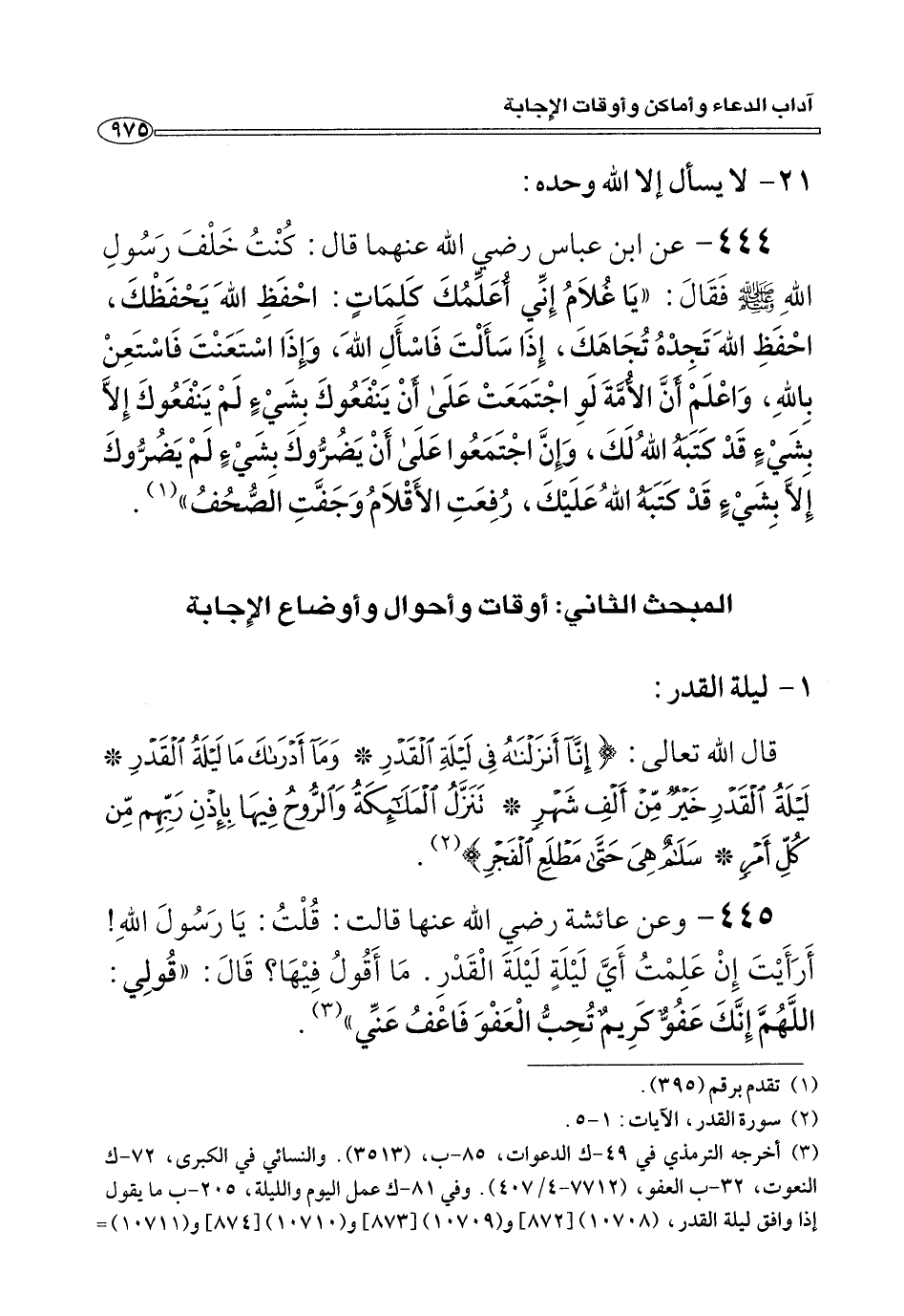 (¬٣) أخرجه الترمذي في ٤٩ - ك الدعوات، ٨٥ - ب، (٣٥١٣). والنسائي في الكبرى، ٧٢ - ك النعوت، ٣٢ - ب العفو، (٧٧١٢ - ٤/ ٤٠٧). وفي ٨١ - ك عمل اليوم والليلة، ٢٠٥ - ب ما يقول إذا وافق ليلة القدر، (١٠٧٠٨) [٨٧٢] و (١٠٧٠٩) [٨٧٣] و (١٠٧٠١٠) [٨٧٤] و (١٠٧١١) =