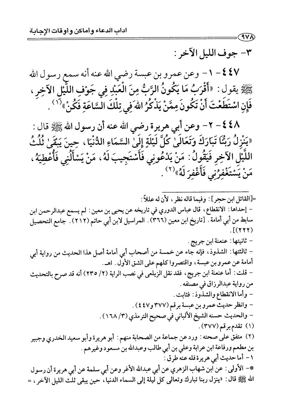 ٤٤٧ - ١ - وعن عمرو بن عبسة رضي الله عنه أنه سمع رسول الله صلى الله عليه وسلم يَقُولُ: «أَقْرَبُ مَا يَكُونُ الرَّبُّ مِنَ الْعَبْدِ فِي جَوْفِ اللَّيْلِ الآخِرِ، فَإِنْ اسْتَطَعْتَ أَنْ تَكُونَ مِمَّنْ يَذْكُرُ اللهَ فِي تِلْكَ السَّاعَةِ فَكُنْ» (¬١).