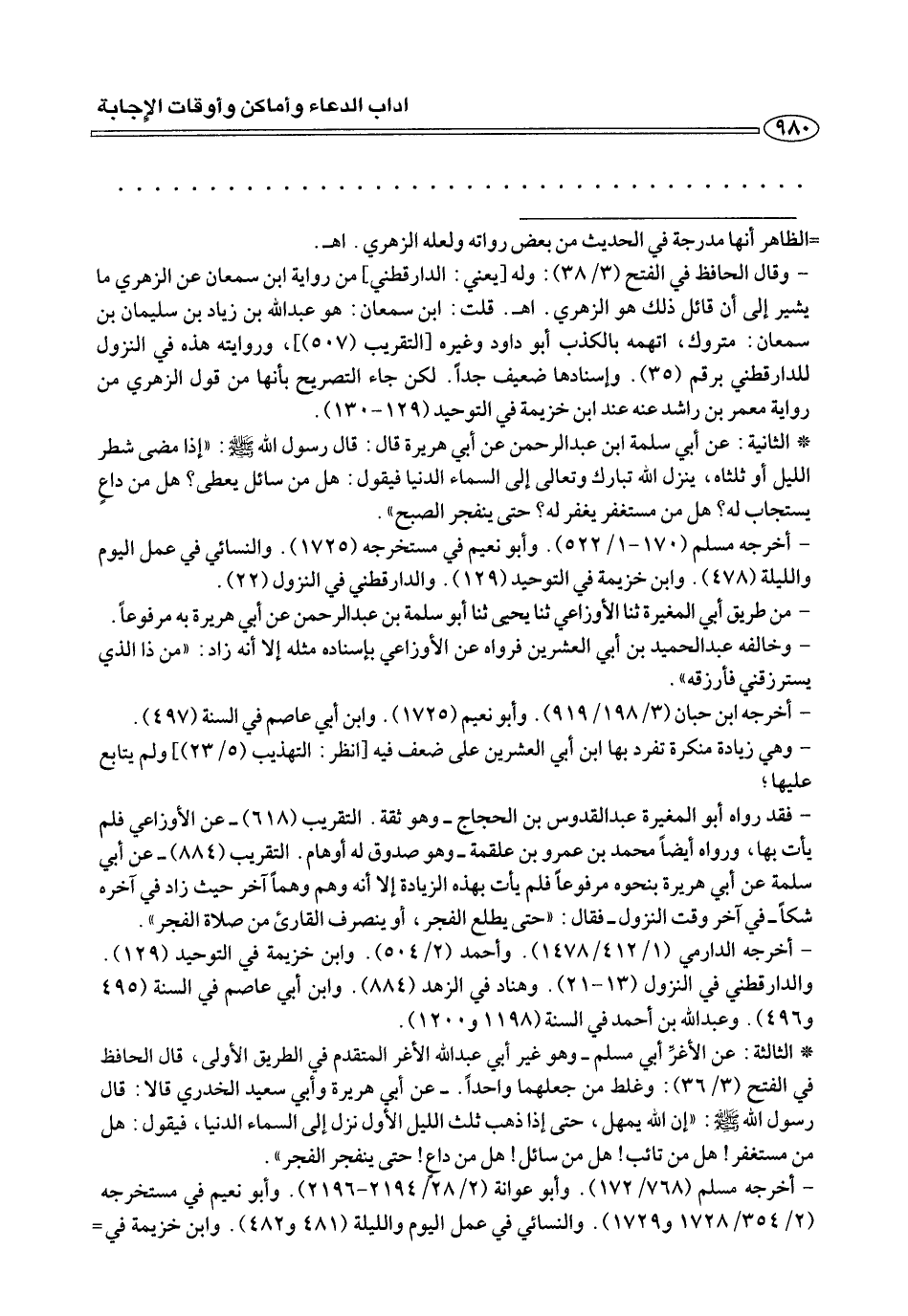 - فقد رواه أبو المغيرة عبد القدوس بن الحجاج- وهو ثقة. التقريب (٦١٨) - عن الأوزاعي فلم يأت بها، ورواه أيضا محمد بن عمرو بن علقمة- وهو صدوق له أوهام. التقريب (٨٨٤) - عن أبي سلمة عن أبي هريرة بنحوه مرفوعًا فلم يأت بهذه الزيادة إلا أنه وهم وهمأ آخر حيث زاد في آخره شكًا- في آخر وقت النزول- فقال: «حتي يطلع الفجر، أو ينصرف القارئ من صلاة الفجر».