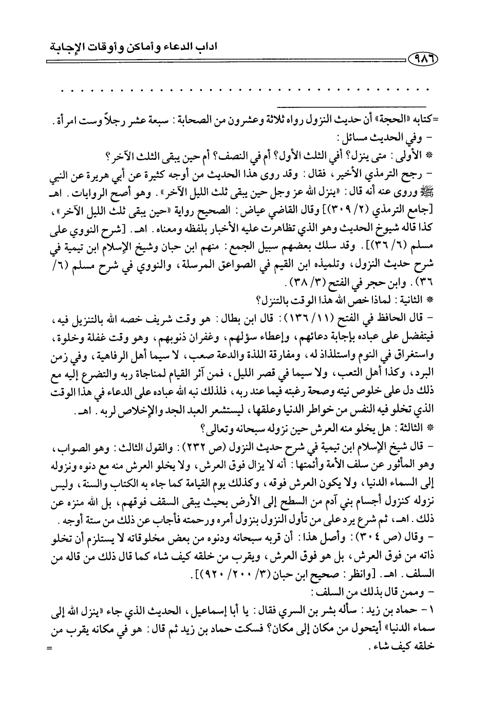 = كتابه "الحجة" أن حديث النزول رواه ثلاثة وعشرون من الصحابة: سبعة عشر رجلًا وست امرأة.