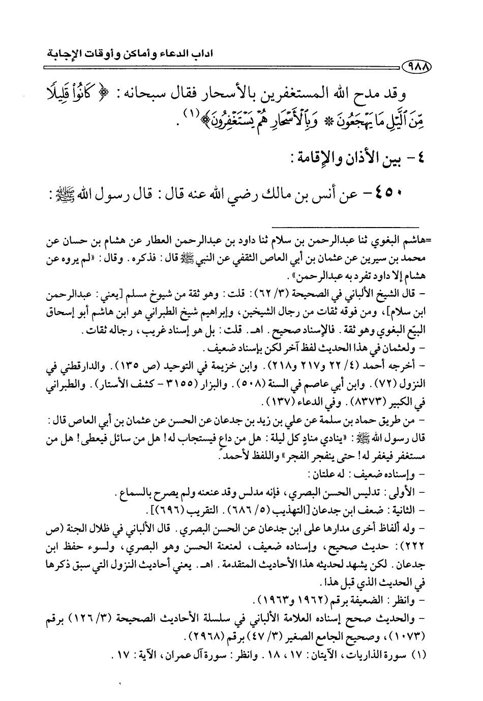 وقد مدح الله المستغفرين بالأسحار فقَالَ سبحانه: {كانوا قليلا من اليل مَا يهجعون * وبالأسحار هم يستغفرون} (¬١).