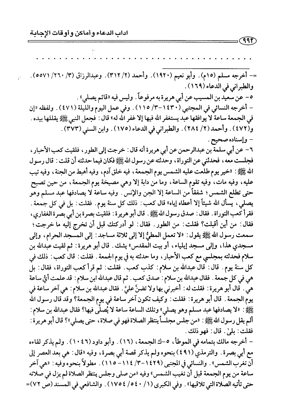 - أخرجه مالك بتمامه في الموطأ، ٥ - ك الجمعة، (١٦). وأبو داود (١٠٤٦). وَلَمْ يذكر لقاءه مع أبي بصرة. والترمذي (٤٩١) بنحوه وَلَمْ يذكر قصة وَلَمْ يذكر قصة أبي بصرة، وفيه» قال: هي بعد العصر إلي أن تغرب الشمس». والنسائي في المجتبي (١٤٢٩ - ٣/ ١١٤ - ١١٥). مطولًا بنحوه وفيه.» هي آخر ساعة من يوم الجمعة قبل أن تغيب الشمس» وفيه» من صلي وجلس ينتظر الصلاة لم ينزل في صلاته حتى تأتيه الصلاة التي تلاقيها». وفي الكبرى (١/ ٥٤٠/ ١٧٥٤). والشافعي في المسند (ص ٧٢) =