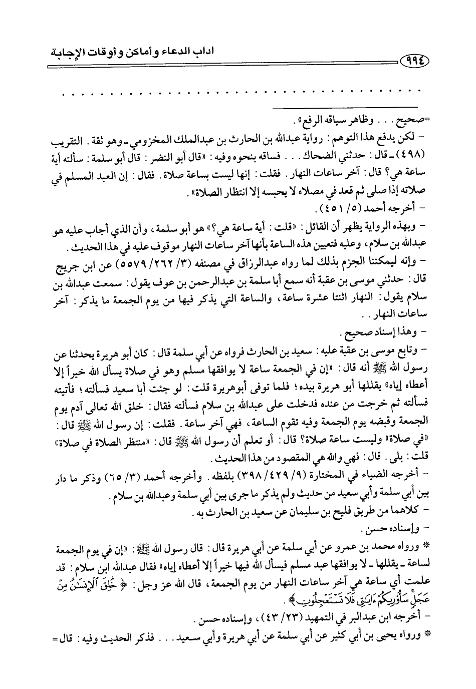- وإنه ليمكننا الجزم بذلك لما رواه عبد الرزاق في مصتفه (٣/ ٢٦٢/ ٥٥٧٩) عن ابن جريج قال: حدثني موسى بن عقبة أنه سمع أبا سلمة بن عبد الرحمن بن عوف يقول: سمعت عبد الله بن سلام يقول: النهار اثنتا عشرة ساعة، والساعة التي يذكر فيها من يوم الجمعة ما يذكر: آخر ساعات النهار ....