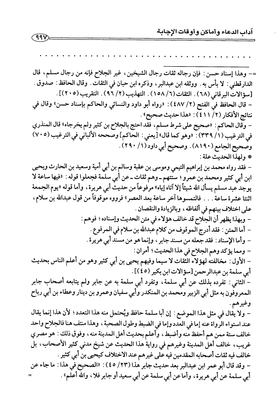 - ولا يقال في مثل هذا الموضع: إن أبا سلمة حافظ ويحتمل منه هذا التعدد؛ لأن هذا إنما يقال عند استواء الرواة عنه إما في العدد وإما في الضبط وطول الصحبة، وهذا منتف هنا فالجلاح واحد خالف ستة ممن هم أحفظظ منه وأضبط، وأعلم بحديث أهل المدينة منه، وفوق ذلك: هو مصري غريب، خالف أهل المدينة وغيرهم في رواية هذا الحديث عن شيخ مدني كثير الأصحاب، بل خالف فيه ثقات أصحابه المقدمين فيه علي غيرهم عند الاختلاف كيحيي بن أبي كثير.