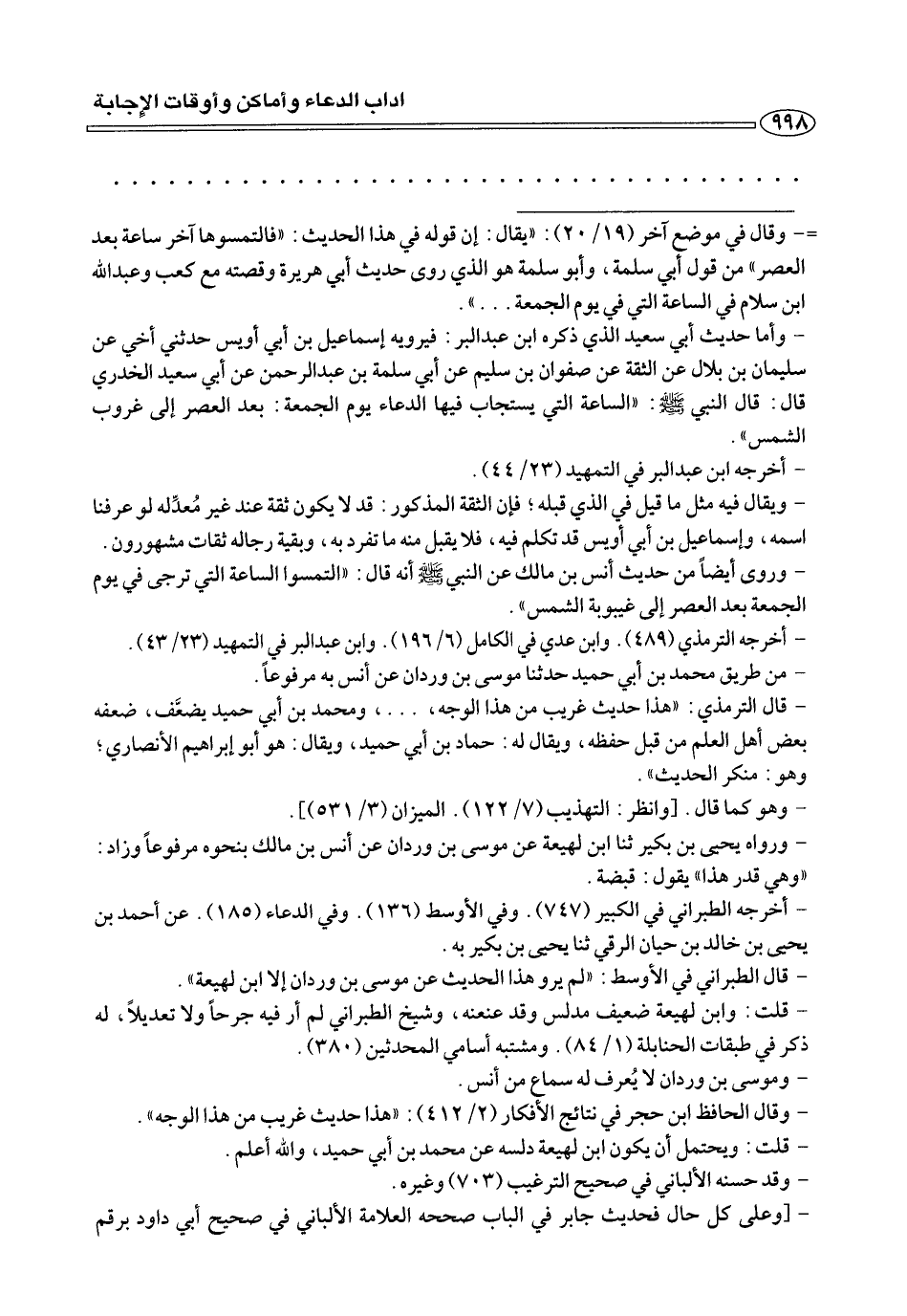 - وأما حديث أبي سعيد الذي ذكره ابن عبد البر: فيرويه إسماعيل بن أبي أويس حدثني أخي عن سليمان بن بلال عن الثقة عن صفوان بن سليم عن أبي سلمة بن عبد الرحمن عن أبي سعيد الخدري قال: قال النبي صلى الله عليه وسلم: «الساعة التي يستجاب فيها الدعاء يوم الجمعة: بعد العصر إلي غروب الشمس».