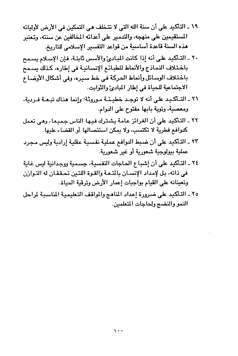 24- التأكيد على أن إشباع الحاجات النفسية، جسمية ووجدانية ليس غاية في ذاته، بل لإمداد الإنسان بالمتعة والقوة اللتين تحققان له التوازن وتعينانه على القيام بواجبات إعمار الأرض وترقية الحياة.