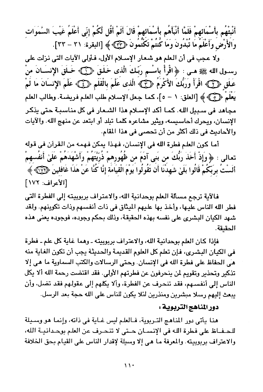 هنا يأتي دور المناهج التربوية، فالعلم ليس غاية في ذاته، وإنما هو وسيلة للحفاظ على فطرة الله في الإنسان حتى لا تنحرف عن العلم بوحدانية الله، والاعتراف بربوبيته، والمعرفة ما هي إلا وسيلة لإقدار الناس على القيام بحق الخلافة