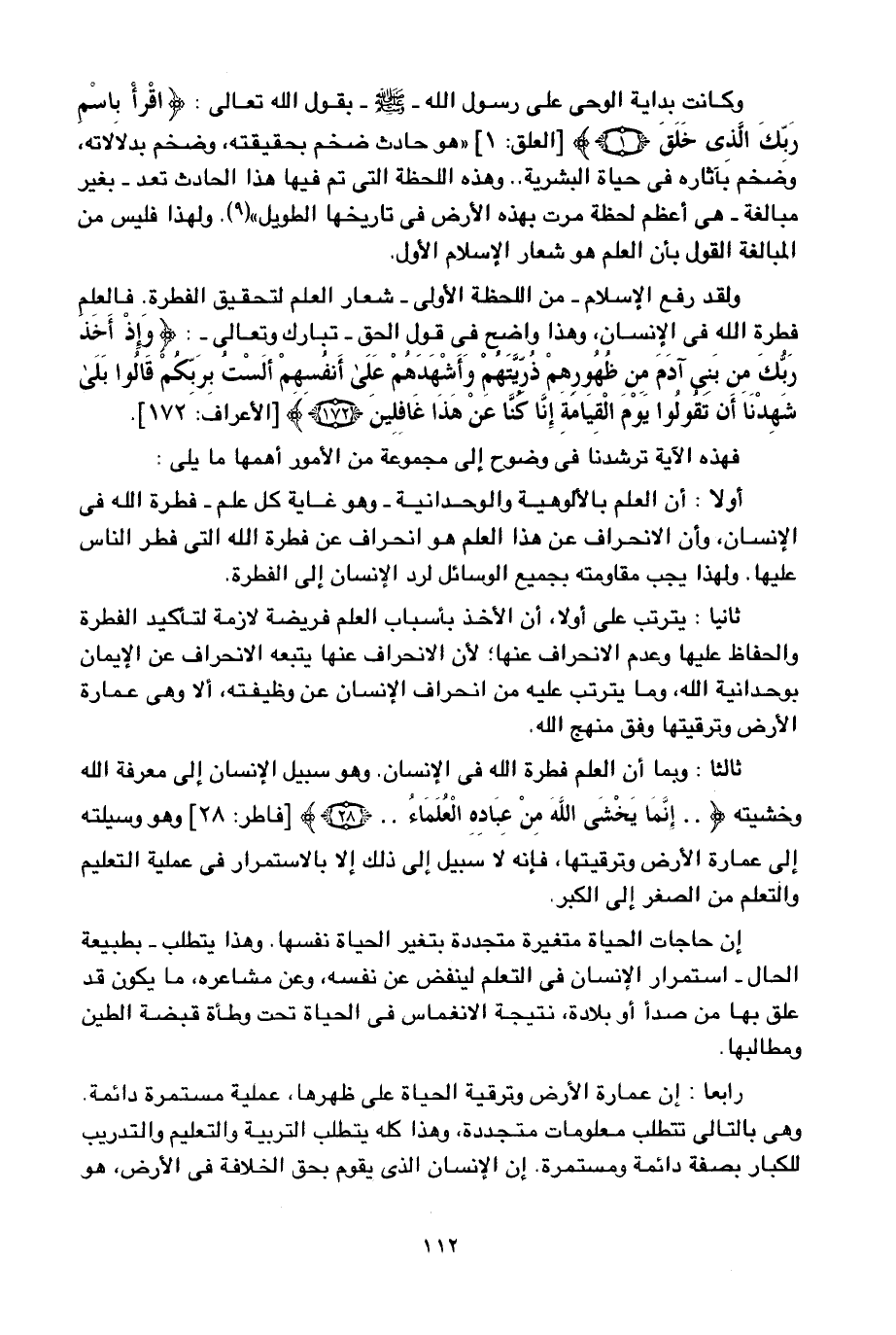 ثالثا: وبما أن العلم فطرة الله في الإنسان، وهو سبيل الإنسان إلى معرفة الله وخشيته {إِنَّمَا يَخْشَى اللَّهَ مِنْ عِبَادِهِ الْعُلَمَاءُ} [فاطر: 28] وهو وسيلته إلى عمارة الأرض وترقيتها، فإنه لا سبيل إلى ذلك إلا بالاستمرار في عملية التعليم والتعلم من الصغر إلى الكبر.