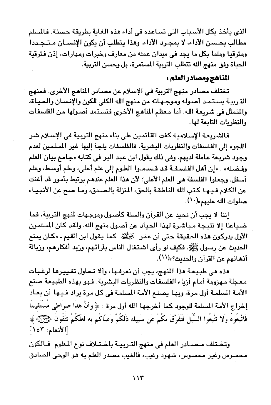 إننا لا يجب أن نحيد عن القرآن والسنة, كأصول وموجهات لمنهج التربية، فما ضياعنا إلا نتيجة مباشرة لهذا الحياد عن أصول منهج الله، ولقد كان المسلمون الأول يدركون هذه الحقيقة حتى إن عمر رضي الله عنه كما يقول ابن القيم: "كان يمنع الحديث عن رسول الله -صلى الله عليه وسلم، فكيف لو رأى اشتغال الناس بآرائهم، وزبد أفكارهم، وزبالة أذهانهم عن القرآن والحديث؟ "2.