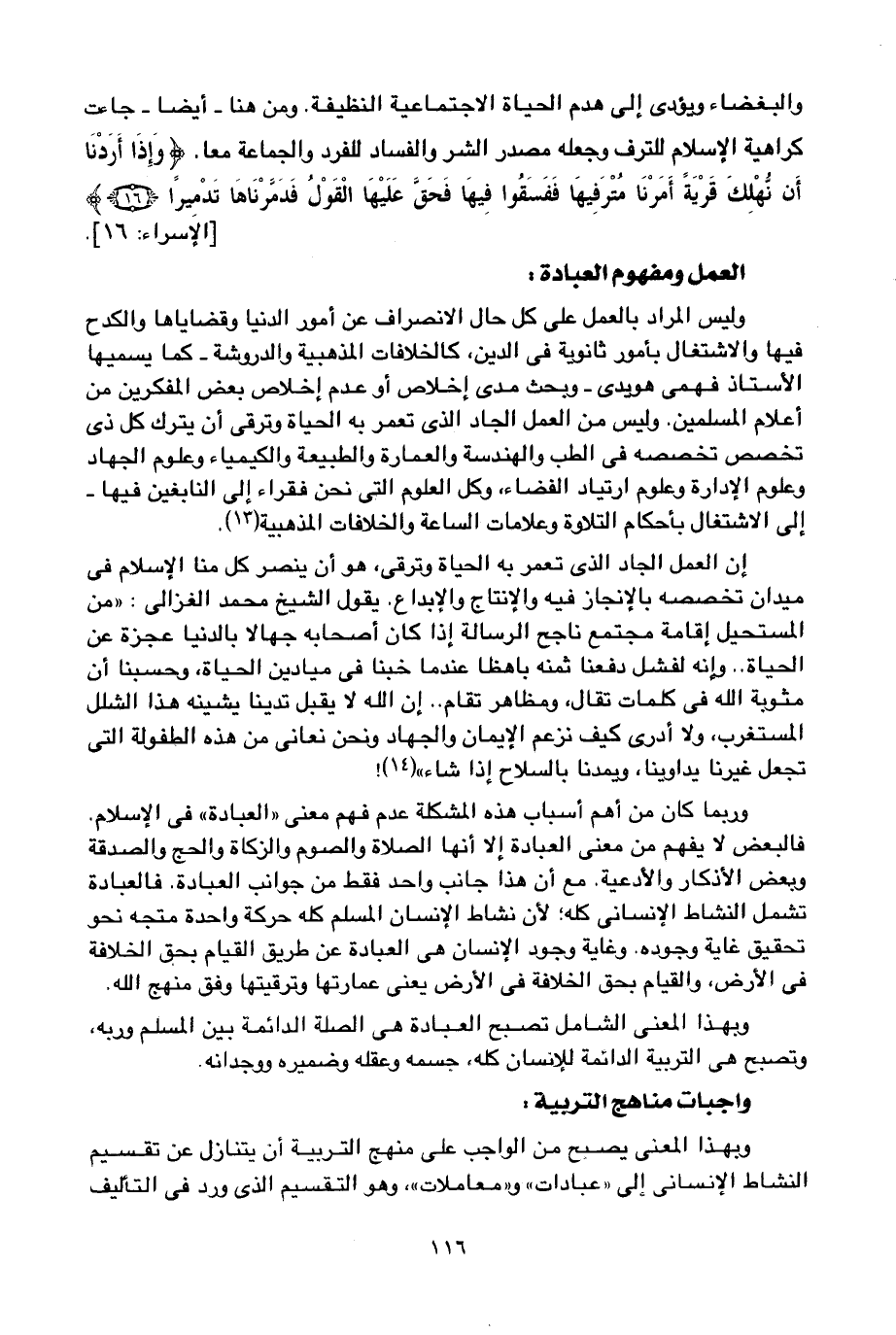 وبهذا المعنى يصبح من الواجب على منهج التربية أن يتنازل عن تقسيم النشاط الإنساني إلى "عبادات" و"معاملات"، وهو التقسيم الذي ورد في التأليف