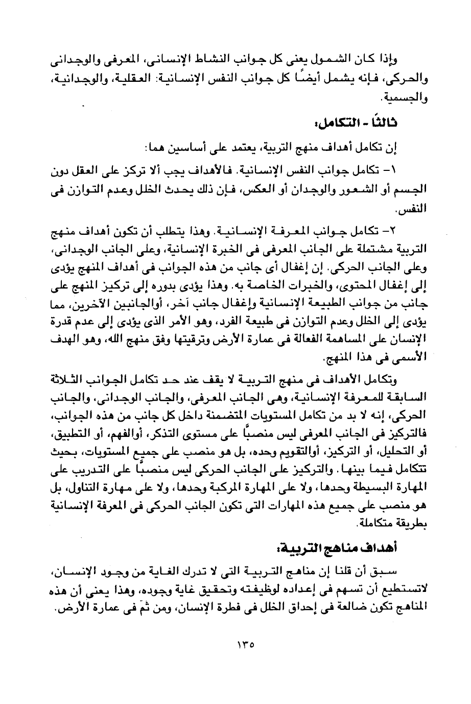 2- تكامل جوانب المعرفة الإنسانية، وهذا يتطلب أن تكون أهداف منهج التربية مشتملة على الجانب المعرفي في الخبرة الإنسانية، وعلى الجانب الوجداني، وعلى الجانب الحركي. إن إغفال أي جانب من هذه الجوانب في أهداف المنهج يؤدي إلى إغفال المحتوى، والخبرات الخاصة به، وهذا يؤدي بدوره إلى تركيز المنهج على جانب من جوانب الطبيعة الإنسانية وإغفال جانب آخر، أو الجانبين الآخرين، مما يؤدي إلى الخلل وعدم التوازن في طبيعة الفرد، وهو الأمر الذي يؤدي إلى عدم قدرة الإنسان على المساهمة الفعالة في عمارة الأرض وترقيتها وفق منهج الله، وهو الهدف الأسمى في هذا المنهج.