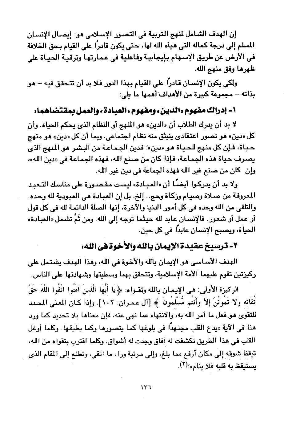 إن الهدف الشامل لمنهج التربية في التصور الإسلامي هي: إيصال الإنسان المسلم إلى درجة كماله التي هيأه الله لها، حتى يكون قادرا على القيام بحق الخلافة في الأرض عن طريق الإسهام بإيجابية وفاعلية في عمارتها وترقية الحياة على ظهرها وفق منهج الله.