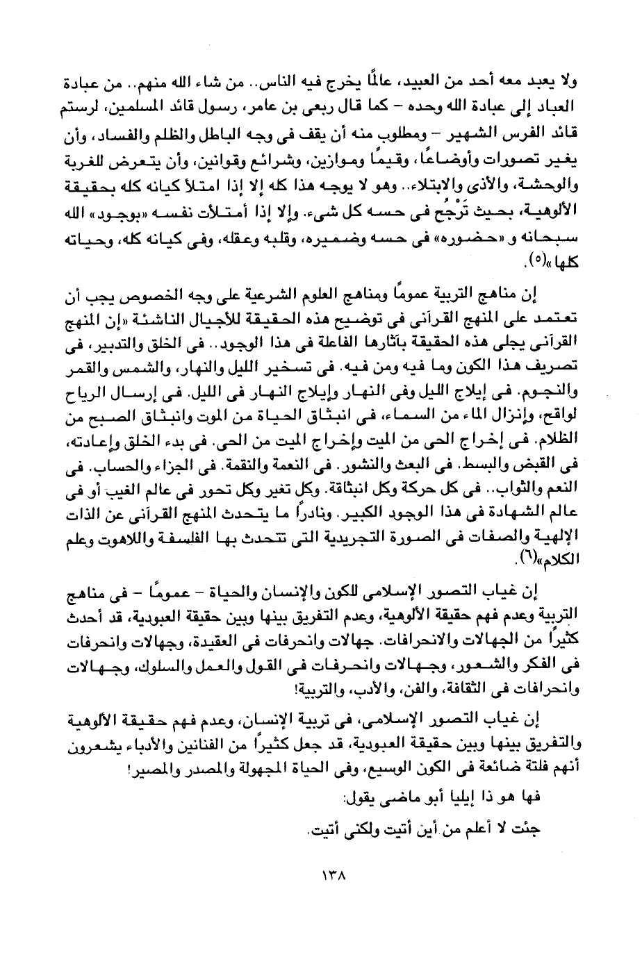 إن غياب التصور الإسلامي للكون والإنسان والحياة -عموما- في مناهج التربية وعدم فهم حقيقة الألوهية، وعدم التفريق بينها وبين حقيقة العبودية، قد أحدث كثير من الجهالات والانحرافات جهالات وانحرفات في العقيدة، وجهالات وانحرافات في الفكر والشعور، وجهالات وانحرافات في القول والعمل والسلوك، وجهالات وانحرافات في الثقافة، والفن، والأدب، والتربية!