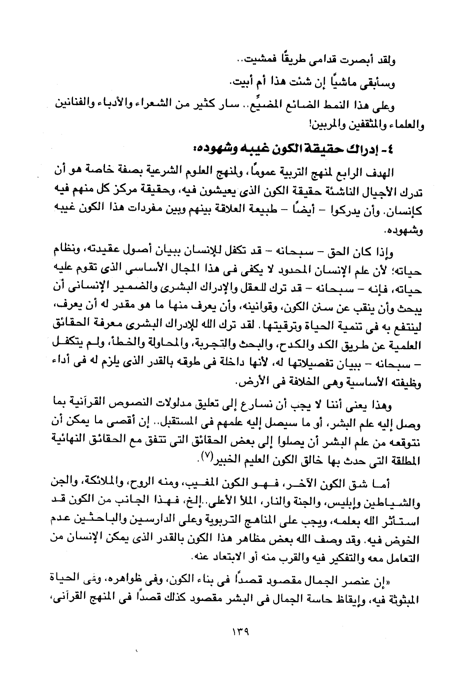 الهدف الرابع لمنهج التربية عموما، ولمنهج العلوم الشرعية بصفة خاصة هو أن تدرك الأجيال الناشئة حقيقة الكون الذي يعيشون فيه، وحقيقة مركز كل منهم فيه كإنسان، وأن يدركوا -أيضا- طبيعة العلاقة بينهم وبين مفردات هذا الكون غيبه وشهوده.
