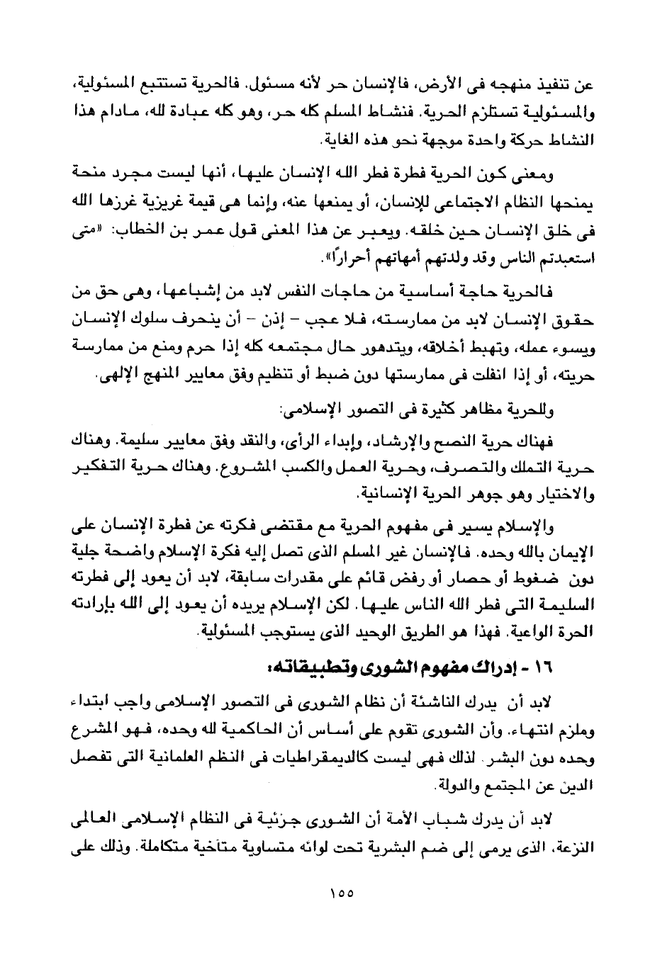 من الضروري أن يدرك الناشئة أن الله قد فطر الإنسانية على الحرية، فالحرية فطرة في الطبيعة الإنسانية، فالله -سبحانه- خلق الإنسان حرا، لأنه جعله مسئولا عن تنفيذ منهجه في الأرض، فالإنسان حر لأنه مسئول. فالحرية تستتبع المسئولية، والمسئولية تستلزم الحرية. فنشاط المسلم كله حر، وهو كله عبادة لله، ما دام هذا النشاط حركة واحدة موجهة نحو هذه الغاية.