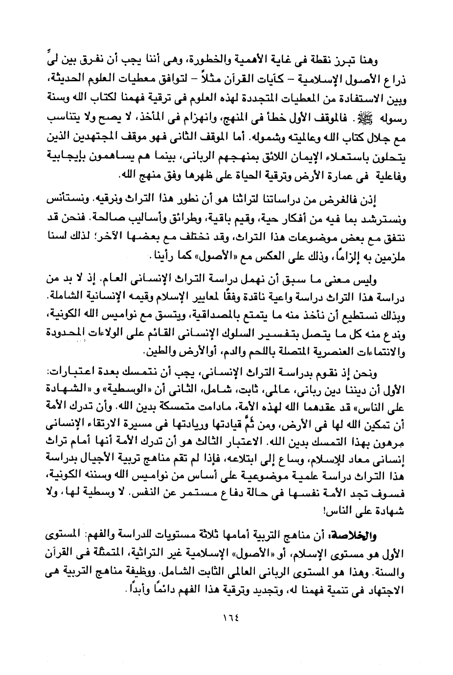 ونحن إذ نقوم بدراسة التراث الإنساني، يجب أن نتمسك بعدة اعتبارات: الأول أن ديننا دين رباني، عالمي، ثابت، شامل، الثاني أن "الوسطية" و"الشهادة على الناس" قد عقدهما الله لهذه الأمة، ما دامت متمسكة بدين الله، وأن تدرك الأمة أن تمكين الله لها في الأرض، ومن ثم قيادتها وريادتها في مسيرة الارتقاء الإنساني مرهون بهذا التمسك بدين الله. الاعتبار الثالث هو أن تدرك الأمة أنها أمام تراث إنساني معاد للإسلام، وساع إلى ابتلاعه، فإذا لم تقم مناهج تربية الأجيال بدراسة هذا التراث دراسة علمية موضوعية على أساس من نواميس الله وسننه الكونية، فسوف تجد الأمة نفسها في حالة دفاع مستمر عن النفس. لا وسطية لها، ولا شهادة على الناس!