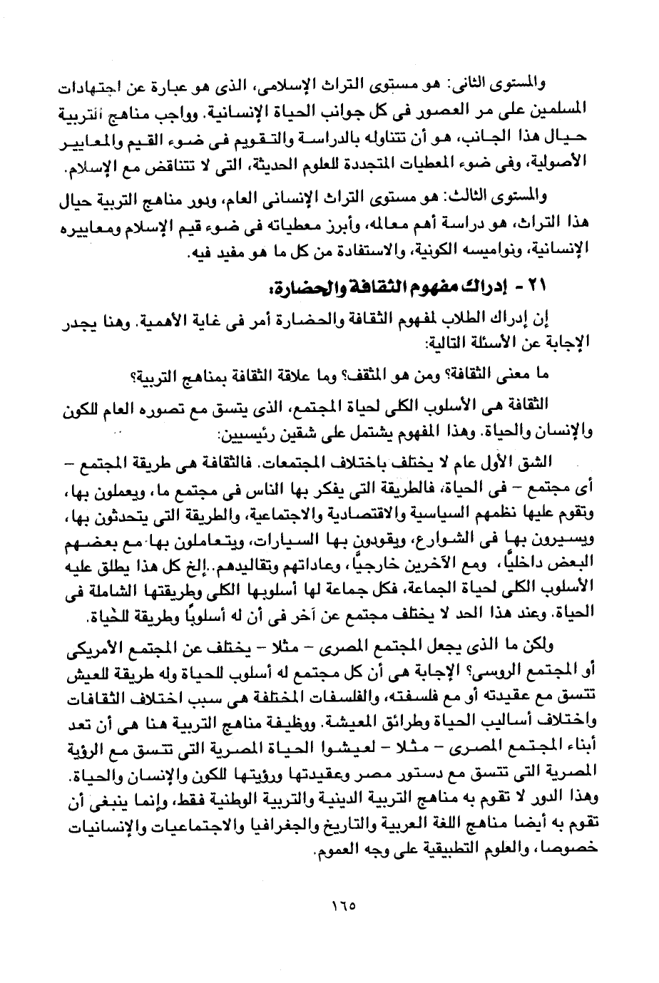 ولكن ما الذي يجعل المجتمع المصري -مثلا- يختلف عن المجتمع الأمريكي أو المجتمع الروسي؟ الإجابة هي أن كل مجتمع له أسلوب للحياة وله طريقة للعيش تتسق مع عقيدته أو مع فلسفته، والفلسفات المختلفة هي سبب اختلاف الثقافات واختلاف أساليب الحياة وطرائق المعيشة. ووظيفة مناهج التربية هنا هي أن تعد أبناء المجتمع المصري -مثلا- لعيشوا الحياة المصرية التي تتسق مع الرؤية المصرية التي تتسق مع دستور مصر وعقيدتها ورؤيتها للكون والإنسان والحياة. وهذا الدور لا تقوم به مناهج التربية الدينية والتربية الوطنية فقط، وإنما ينبغي أن تقوم به أيضا مناهج اللغة العربية والتاريخ والجغرافيا والاجتماعيات والإنسانيات خصوصا، والعلوم التطبيقية على وجه العموم.