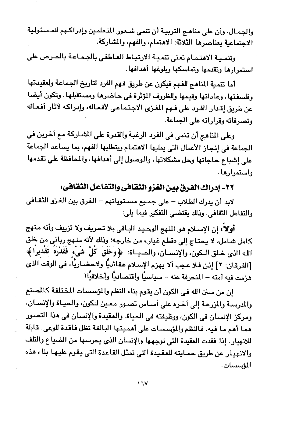 والجمال، وأن على مناهج التربية أن تنمي شعور المتعلمين وإدراكهم للمسؤلية الاجتماعية بعناصرها الثلاثة: الاهتمام، والفهم، والمشاركة.
