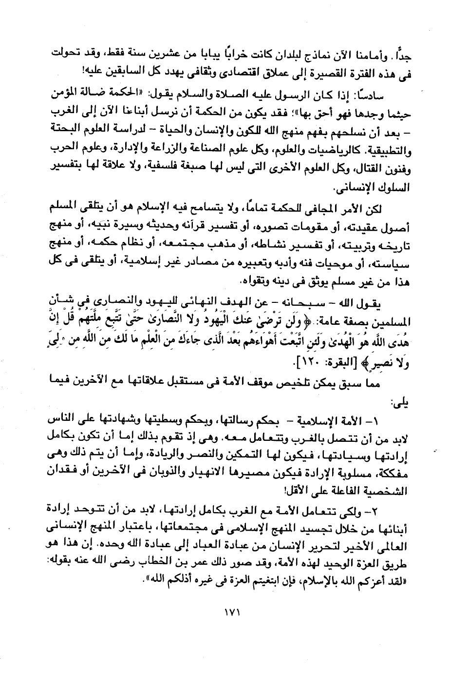 سادسا: إذا كان الرسول عليه الصلاة والسلام يقول: "الحكمة ضالة المؤمن حيثما وجدها فهو أحق بها"؛ فقد يكون من الحكمة أن نرسل أبناءنا الآن إلى الغرب -بعد أن نسلحهم بفهم منهج الله للكون والإنسان والحياة- لدراسة العلوم البحتة والتطبيقية. كالرياضيات والعلوم، وكل علوم الصناعة والزراعة والإدارة، وعلوم الحرب وفنون القتال، وكل العلوم الأخرى التي ليس لها صبغة فلسفية، ولا علاقة لها بتفسير السلوك الإنساني.