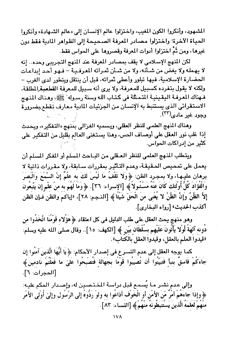 لكن المنهج الإسلامي لا يقف بمصادر المعرفة عند المنهج التجريبي وحده.. إنه لا يهمله ولا يغض من شأنه، ولا من شأن ثمراته المعرفية -فهو أحد إبداعات الحضارة الإسلامية، فيها تبلور وأعطى ثمراته، قبل أن ينتقل ويتطور لدى الغرب- ولكنه لا يقول بتفرده كسبيل للمعرفة، ولا يرى أنه سبيل للمعرفة القطعية المطلقة، فهناك المعرفة اليقينية المتمثلة في كتاب الله وسنة رسوله -صلى الله عليه وسلم، وهناك المنهج الاستقرائي الذي يستنبط به الإنسان من الجزئيات المادية معارف تقطع بضرورة وجود غير مادي1.