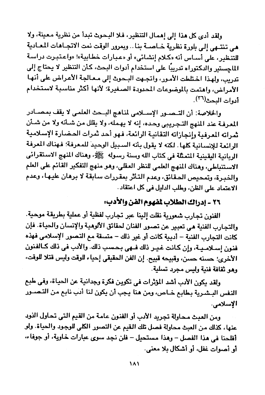 الفنون تجارب شعورية نقلت إلينا عبر تجارب لفظية أو عملية بطريقة موحية. والتجارب الفنية هي تعبير عن تصور الفنان لحقائق الألوهية والإنسان والحياة. فإن كانت التجارب الفنية -أدبية كانت أو غير ذلك- متسقة مع التصور الإسلامي فهذه فنون إسلامية، وإن كانت غير ذلك فهي بحسب ذلك. والأدب في ذلك كالفنون الأخرى؛ حسنه حسن، وقبيحه قبيح. إن الفن الحقيقي إحياء للوقت وليس قتلا للوقت، وهو ثقافة فنية وليس مجرد تسلية.