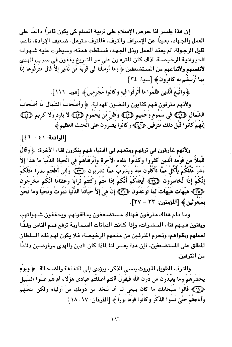 إن هذا يفسر لنا حرص الإسلام على تربية المسلم كي يكون قادرا دائما على العمل والجهاد، بعيدا عن الإسراف والترف. فالمترف مترهل، ضعيف الإرادة، ناعم، قليل الرجولة، لم يعتد العمل وبذل الجهد، فسقطت همته، وسيطرت عليه شهواته الحيوانية الرخيصة، لذلك كان المترفون على مر التاريخ يقفون في سبيل الهدى لأنفسهم ولأتباعهم من المستضعفين: {وَمَا أَرْسَلْنَا فِي قَرْيَةٍ مِنْ نَذِيرٍ إِلَّا قَالَ مُتْرَفُوهَا إِنَّا بِمَا أُرْسِلْتُمْ بِهِ كَافِرُونَ} [سبأ: 34] .