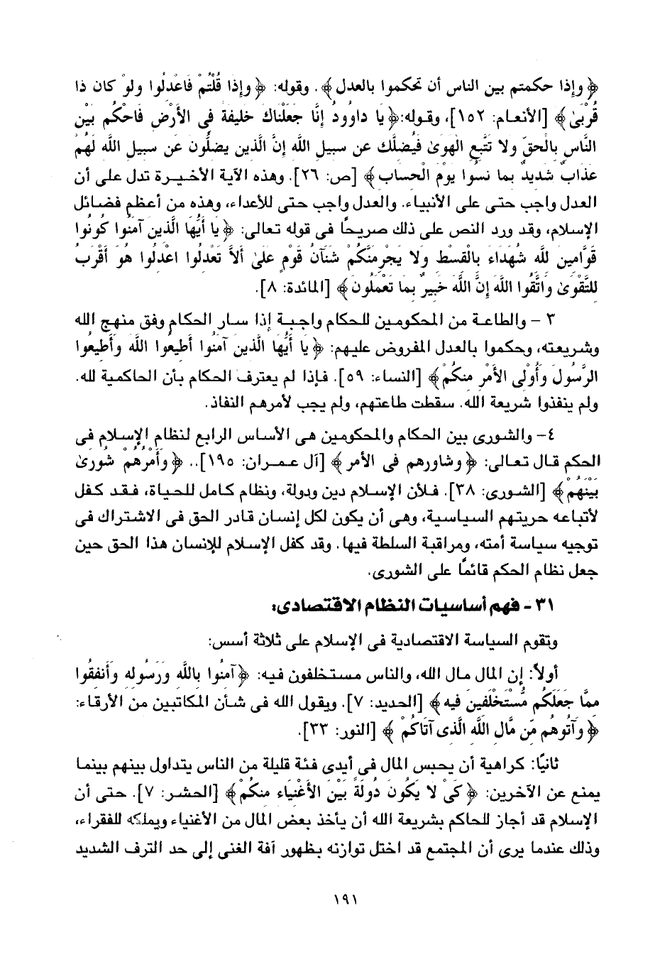 3- والطاعة من المحكومين للحكام واجبة إذا سار الحكام وفق منهج الله وشريعته، وحكموا بالعدل المفروض عليهم: {يَا أَيُّهَا الَّذِينَ آمَنُوا أَطِيعُوا اللَّهَ وَأَطِيعُوا الرَّسُولَ وَأُولِي الْأَمْرِ مِنْكُمْ} [النساء: 59] . فإذا لم يعترف الحكام بأن الحاكمية لله، ولم ينفذوا شريعة الله, سقطت طاعتهم، ولم يجب لأمرهم النفاذ.