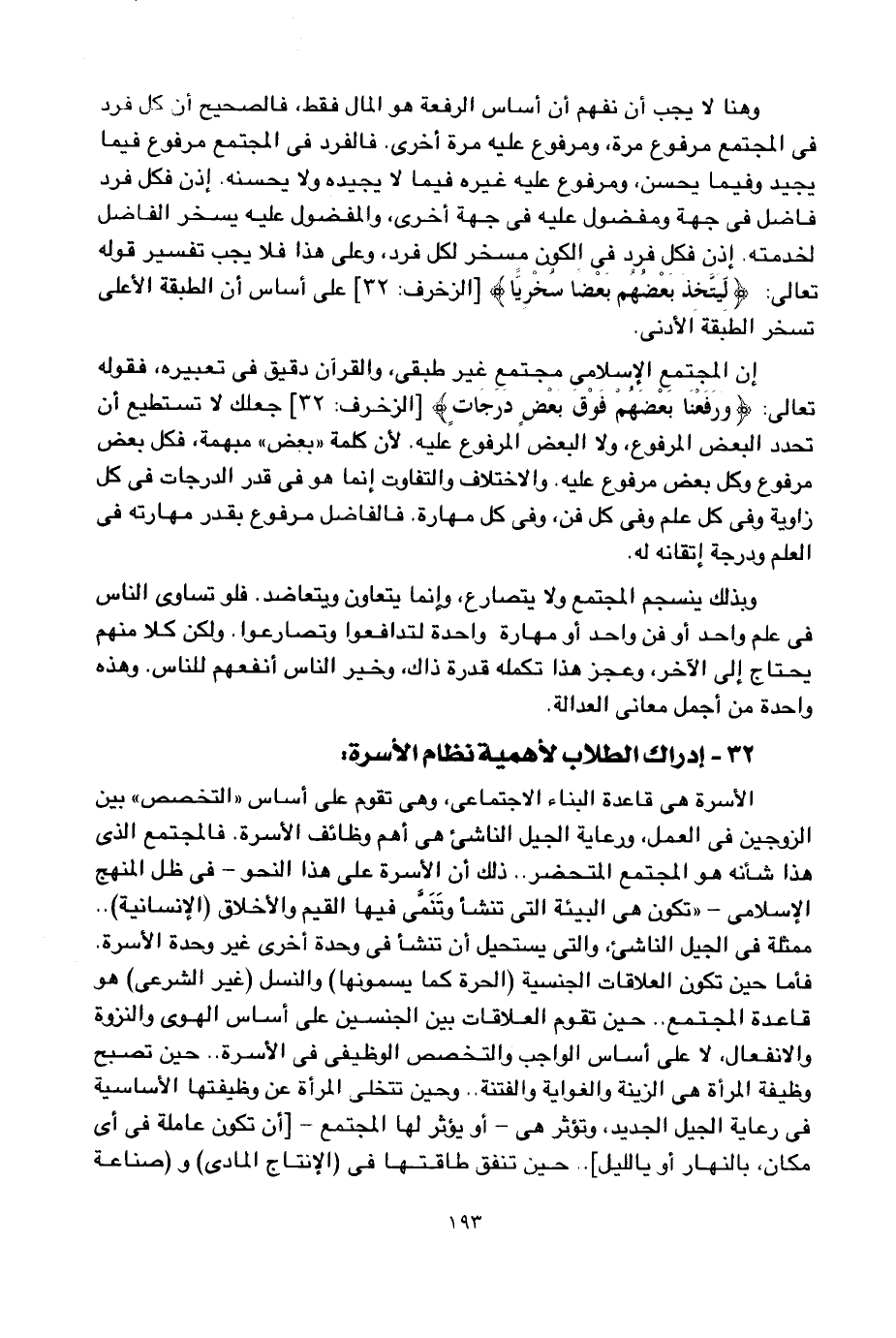 إن المجتمع الإسلامي مجتمع غير طبقي، والقرآن دقيق في تعبيره، فقوله تعالى: {وَرَفَعْنَا بَعْضَهُمْ فَوْقَ بَعْضٍ دَرَجَاتٍ} [الزخرف: 32] جعلك لا تستطيع أن تحدد البعض المرفوع، ولا البعض المرفوع عليه، لأن كلمة "بعض" مبهمة، فكل بعض مرفوع وكل بعض مرفوع عليه، والاختلاف والتفاوت إنما هو في قدر الدرجات في كل زاوية وفي كل علم وفي كل فن، وفي كل مهارة، فالفاضل مرفوع بقدر مهارته في العلم ودرجة إتقانه له.