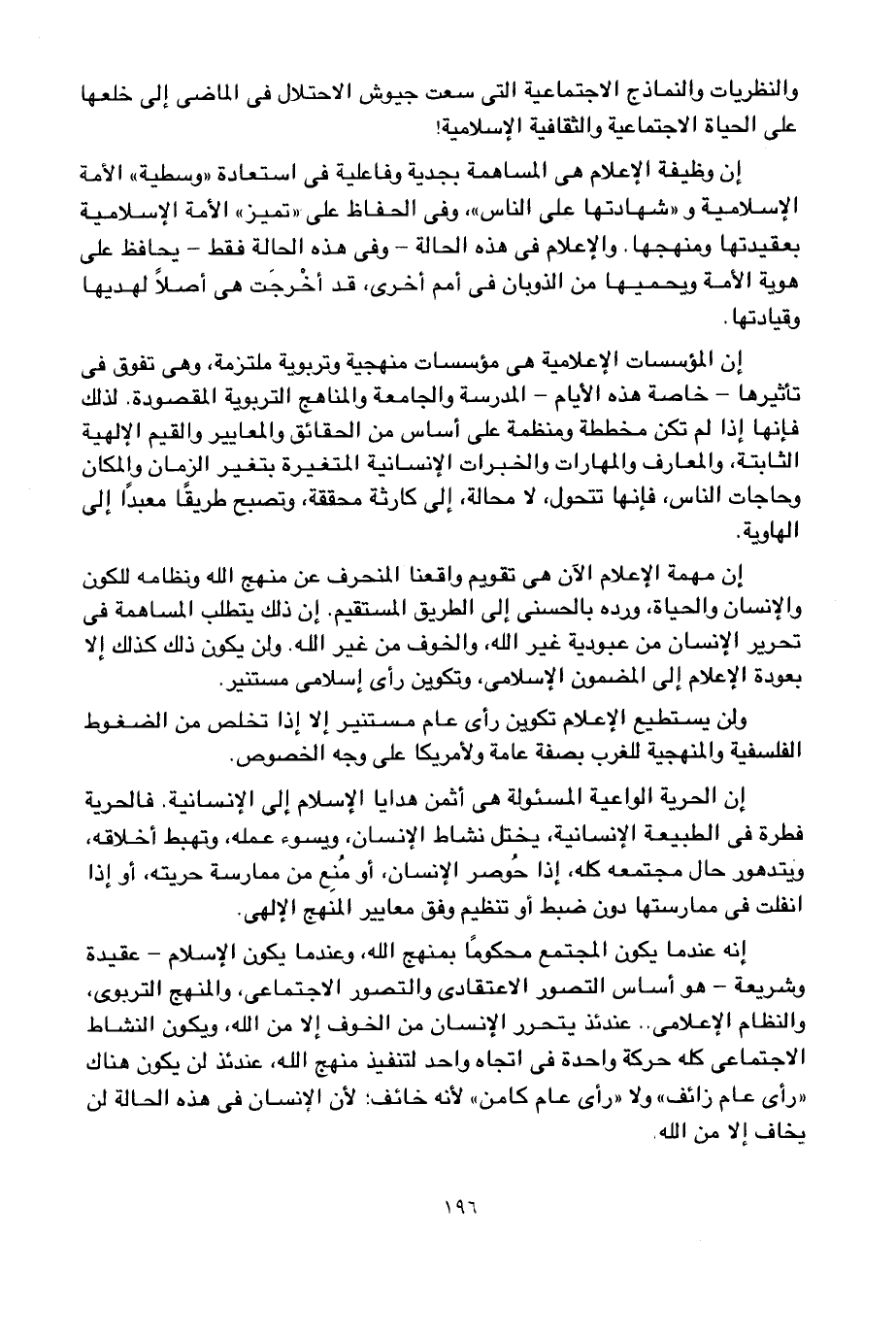 بالرغم من أن كل نظام إعلامي مخطط على أساس سليم، يقوم على أساس فلسفة أو نظرية معينة، وأن أجهزة الإعلام في معظم دول العالم تقوم على خدمة الفلسفات والنظريات والمناهج التي تتبناها تلك الدول، إلا أن الإعلام عندنا نحن المسلمين، ليس "نظاما" ولا يتبع خطة مرسومة بعناية، وإنما هو جهود مبعثرة، ومتناقضة في كثير من الأحيان؛ وأن معظم أنشطته ليست ذات صبغة فنية موحية ومشوقة، بل يغلب عليها الوعظ والتوجيه المباشر؛ وأن أغلبه ليس صادرا عن عقيدة الإسلام وتشريعاته ونظمه الإنسانية والخلقية، وأنه بعيد -إلى حد كبير- عن تحقيق غايات الإسلام ومقاصده، بل إنه يقوم -في معظم الأحيان- بالترويج للفلسفات والنظريات والنماذج الاجتماعية التي سعت جيوش الاحتلال في الماضي إلى خلعها على الحياة الاجتماعية والثقافية الإسلامية!
