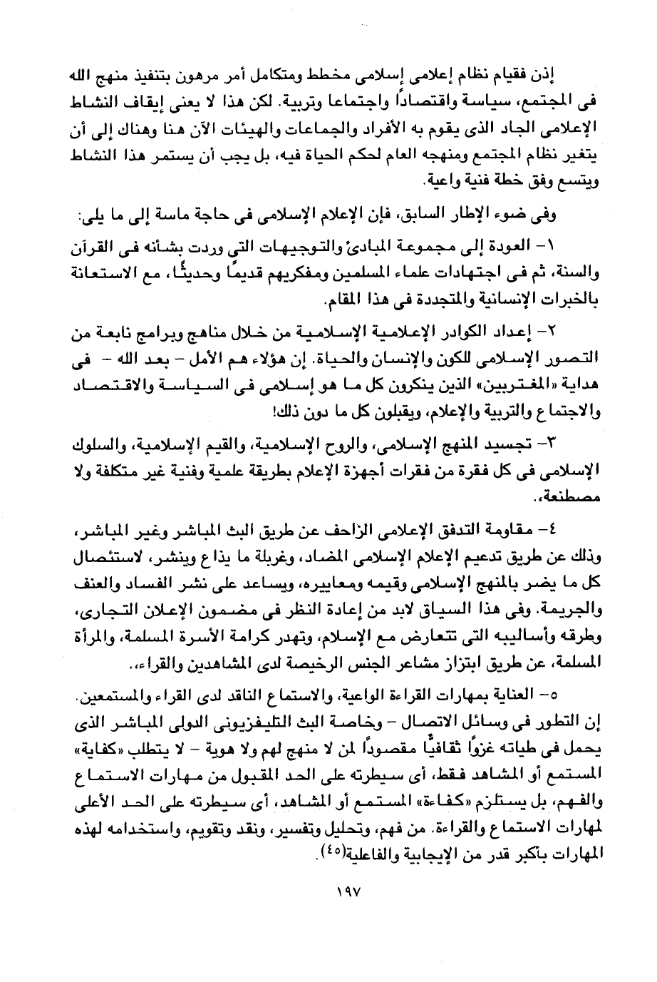 4- مقاومة التدفق الإعلامي الزاحف عن طريق البث المباشر وغير المباشر، وذلك عن طريق تدعيم الإعلام الإسلامي المضاد، وغربلة ما يذاع وينشر، لاستئصال كل ما يضر بالمنهج الإسلامي وقيمه ومعاييره، ويساعد على نشر الفساد والعنف والجريمة، وفي هذا السياق لا بد من إعادة النظر في مضمون الإعلان التجاري، وطرقه وأساليبه التي تتعارض مع الإسلام، وتهدر كرامة الأسرة المسلمة، والمرأة المسلمة، عن طريق ابتزاز مشاعر الجنس الرخيصة لدى المشاهدين والقراء.