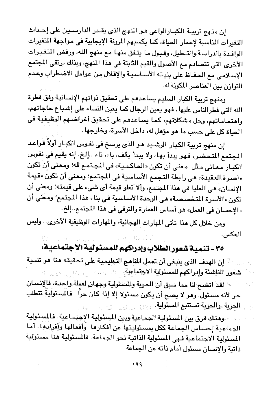 إن منهج تربية الكبار الرشيد هو الذي يرسخ في نفوس الكبار أولا قواعد المجتمع المتحضر، فهو يبدأ بها، ولا يبدأ بألف، باء، تاء ... إلخ. إنه يقيم في نفوس الكبار معاني مثل: معنى أن تكون "الحاكمية" في المجتمع لله؛ ومعنى أن تكون "آصرة العقيدة" هي رابطة التجمع الأساسية في المجتمع؛ ومعنى أن تكون "قيمة الإنسان" هي العليا في هذا المجتمع، وألا تعلو قيمة أي شيء على قيمته؛ ومعنى أن تكون "الأسرة المتخصصة" هي الوحدة الأساسية في بناء هذا المجتمع؛ ومعنى أن "الإحسان في العمل" هو أساس العمارة والترقي في هذا المجتمع.. إلخ.