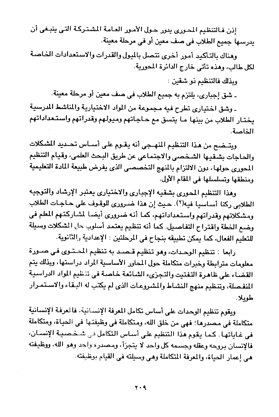 وهذا التنظيم المحوري بشقيه الإجباري والاختياري يعتبر الإرشاد والتوجيه الطلابي ركنا أساسيا فيه1، حيث إن هذا ضروري للوقوف على حاجات الطلاب ومشكلاتهم وقدراتهم واستعداداتهم، كما أنه ضروري أيضا لمشاركتهم المعلم في وضع الخطة واقتراح التفاصيل، كما أنه تنظيم يعتمد أسلوب حل المشكلات وسيلة للتعليم الفعال، كما يمكن تطبيقه بنجاح في المرحلتين: الإعدادية والثانوية.