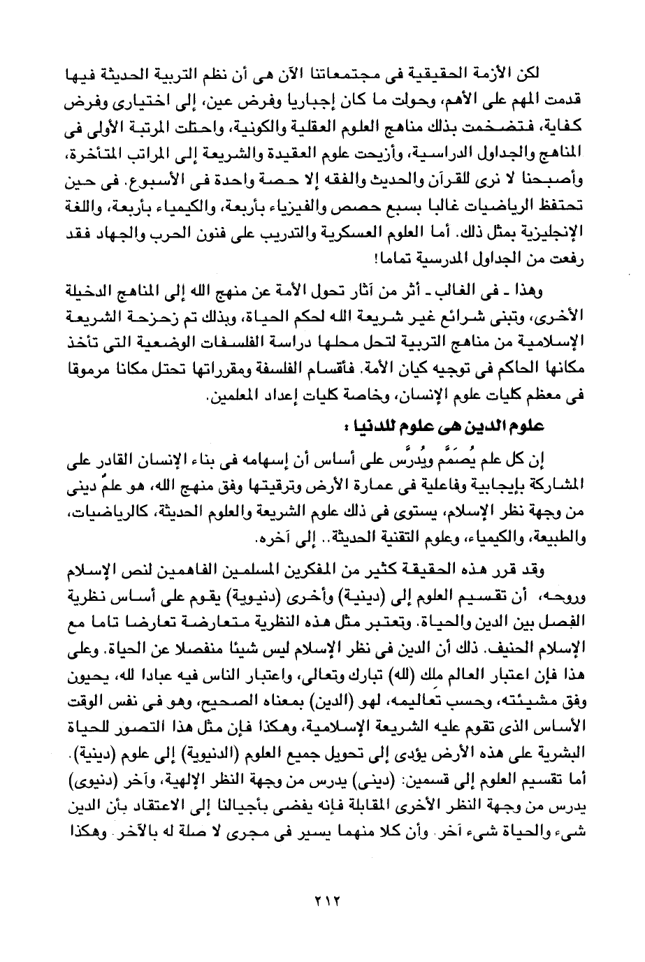 إن كل علم يصمم ويدرس على أساس أن إسهامه في بناء الإنسان القادر على المشاركة بإيجابية وفاعلية في عمارة الأرض وترقيتها وفق منهج الله، هو علم ديني من وجهة نظر الإسلام، يستوي في ذلك علوم الشريعة والعلوم الحديثة، كالرياضيات، والطبيعة، والكيمياء، وعلوم التقنية الحديثة.. إلى آخره.