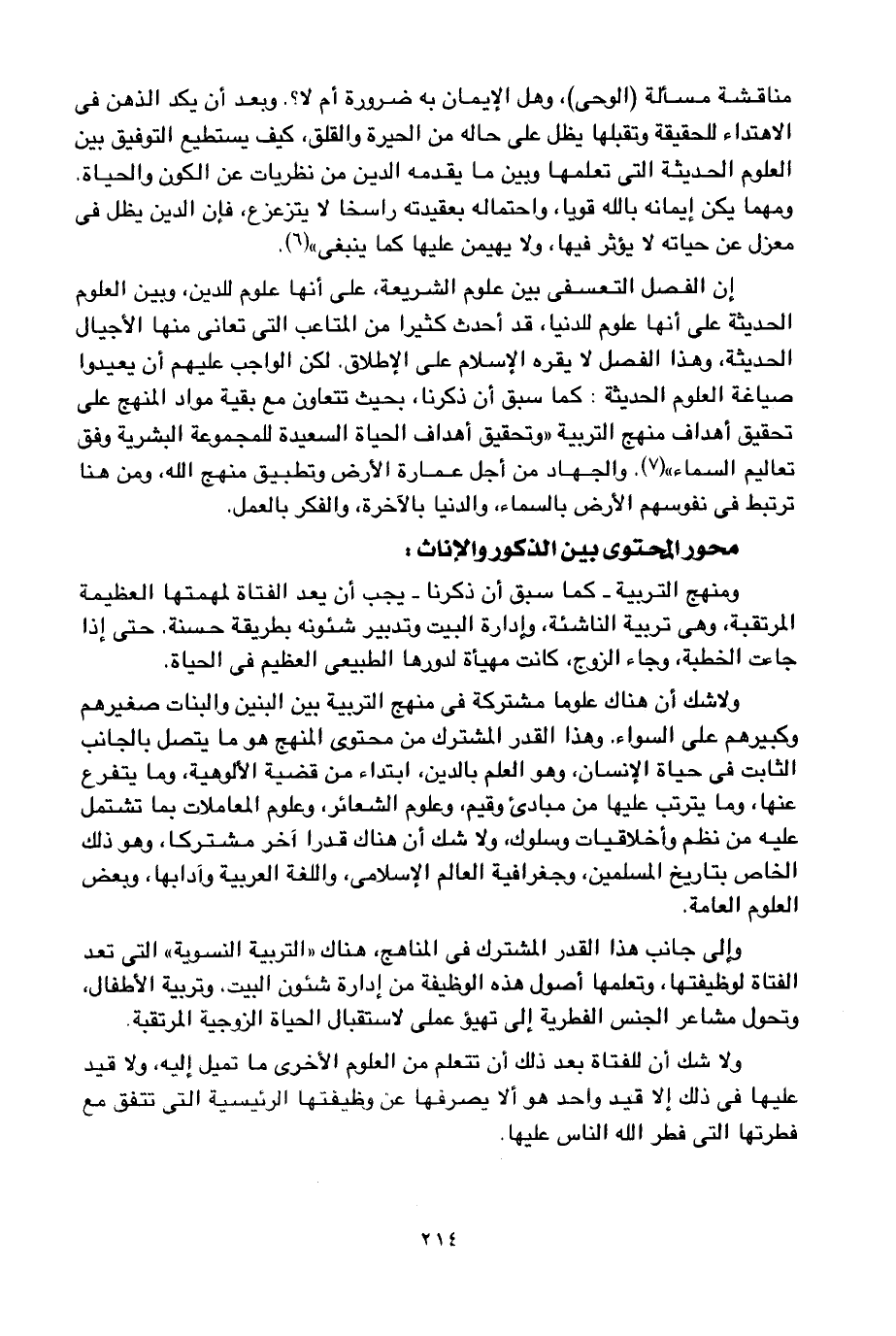 ولا شك أن هناك علوما مشتركة في منهج التربية بين البنين والبنات صغيرهم وكبيرهم على السواء، وهذا القدر المشترك من محتوى المنهج هو ما يتصل بالجانب الثابت في حياة الإنسان، وهو العلم بالدين، ابتداء من قضية الألوهية، وما يتفرع عنها، وما يترتب عليها من مبادئ وقيم, وعلوم شرعية, وعلوم المعاملات بما تشتمل عليه من نظم وأخلاقيات وسلوك، ولا شك أن هناك قدرا آخر مشتركا، وهو ذلك الخاص بتاريخ المسلمين، وجغرافية العالم الإسلامي، واللغة العربية وآدابها، وبعض العلوم العامة.