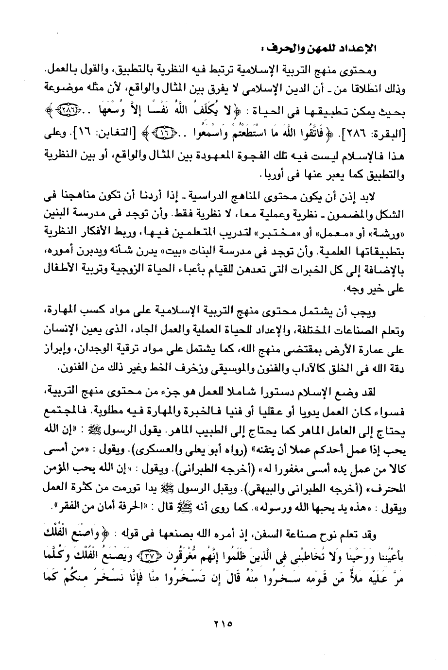 لقد وضع الإسلام دستورا شاملا للعمل هو جزء من محتوى منهج التربية، فسواء كان العمل يدويا أو عقليا أو فنيا فالخبرة والمهارة فيه مطلوبة، فالمجتمع يحتاج إلى العامل الماهر كما يحتاج إلى الطبيب الماهر يقول الرسول -صلى الله عليه وسلم: "إن الله يحب إذا عمل أحدكم عملا أن يتقنه" , "رواه أبو يعلى والعسكري". ويقول: "من أمسى كالا من عمل يده أمسى مغفورا له" , "أخرجه الطبراني". ويقول: "إن الله يحب المؤمن المحترف" , "أخرجه الطبراني والبيهقي". ويقبل الرسول -صلى الله عليه وسلم- يدا تورمت من كثرة العمل ويقول: "هذه يد يحبها الله ورسوله"، كما روي أنه -صلى الله عليه وسلم- قال: "الحرفة أمان من الفقر".