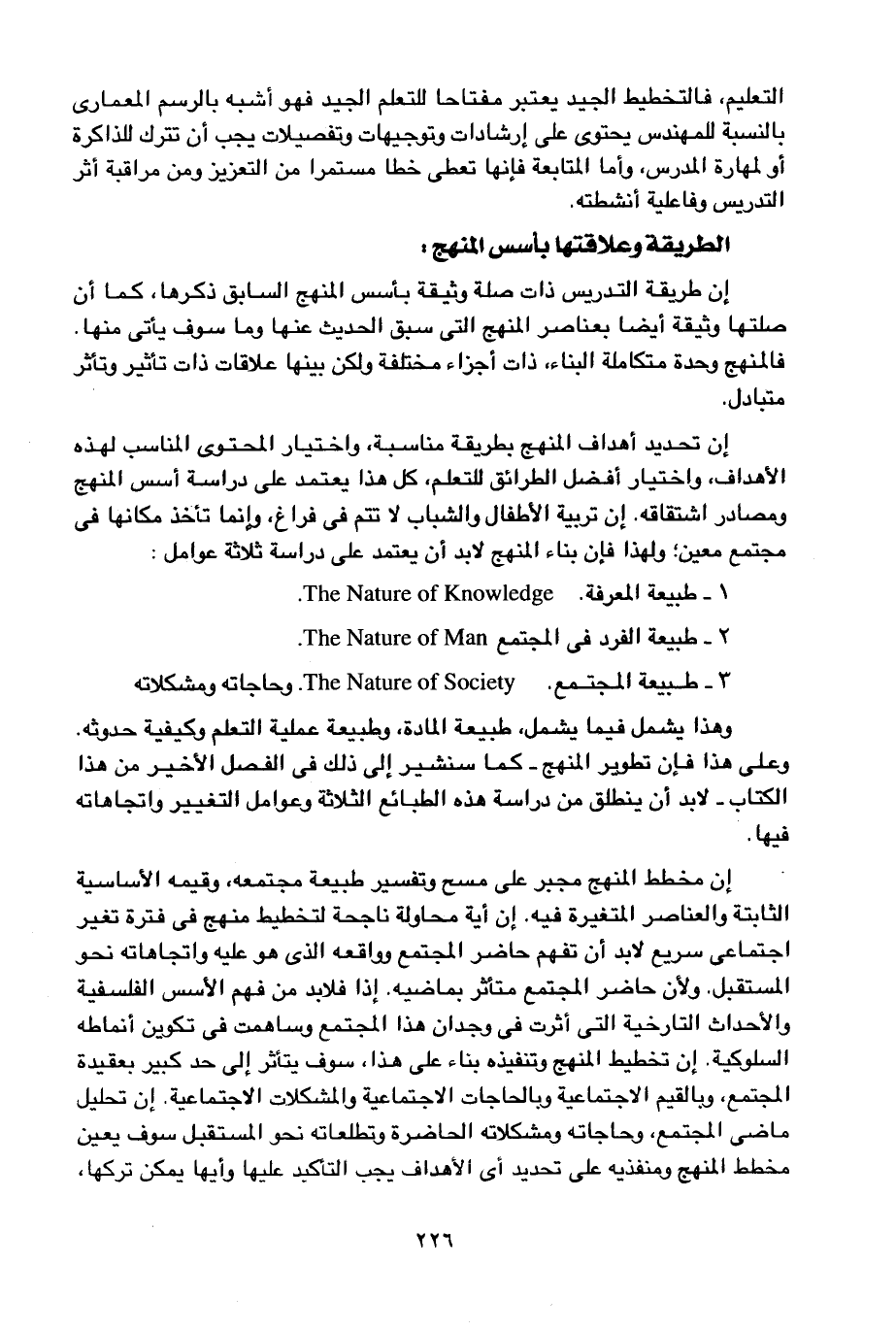 وهذا يشمل فيما يشمل، طبيعة المادة، وطبيعة عملية التعلم وكيفية حدوثه، وعلى هذا فإن تطوير المنهج -كما سنشير إلى ذلك في الفصل الأخير من هذا الكتاب- لا بد أن ينطلق من دراسة هذه الطبائع الثلاثة وعوامل التغيير واتجاهاته فيها.