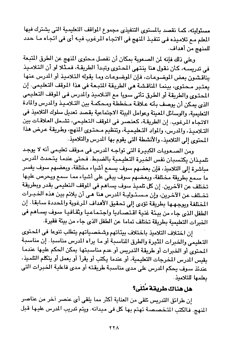 وعلى ذلك فإنه لمن الصعوبة بمكان أن نفصل محتوى المنهج عن الطرق المتبعة في تدريسه، كأن نقول هنا ينتهي المحتوى وتبدأ الطريقة، فمثلا لو أن التلاميذ يناقشون بعض الموضوعات، فإن الموضوعات وما يقوله التلاميذ أو المدرس عنها يعتبر محتوى، بينما المناقشة هي الطريقة المتبعة في هذا الموقف التعليمي, إن المحتوى والطريقة أو الطرق تأتي سويا مع التلاميذ والمدرس في الموقف التعليمي الذي يمكن أن يوصف بأنه علاقة مخططة ومحكمة بين التلاميذ والمدرس والمادة التعليمية، والوسائل المعينة وعوامل البيئة الاجتماعية بقصد تعديل سلوك التلاميذ في الاتجاه المرغوب إن الطريقة، كعنصر في الموقف التعليمي، تشمل العلاقات بين التلاميذ، والمدرس، والمواد التعليمية، وتنظيم محتوى المنهج، وطريقة عرض هذا، المحتوى إلى التلاميذ، والأنشطة التي يقوم بها المدرس والتلاميذ.