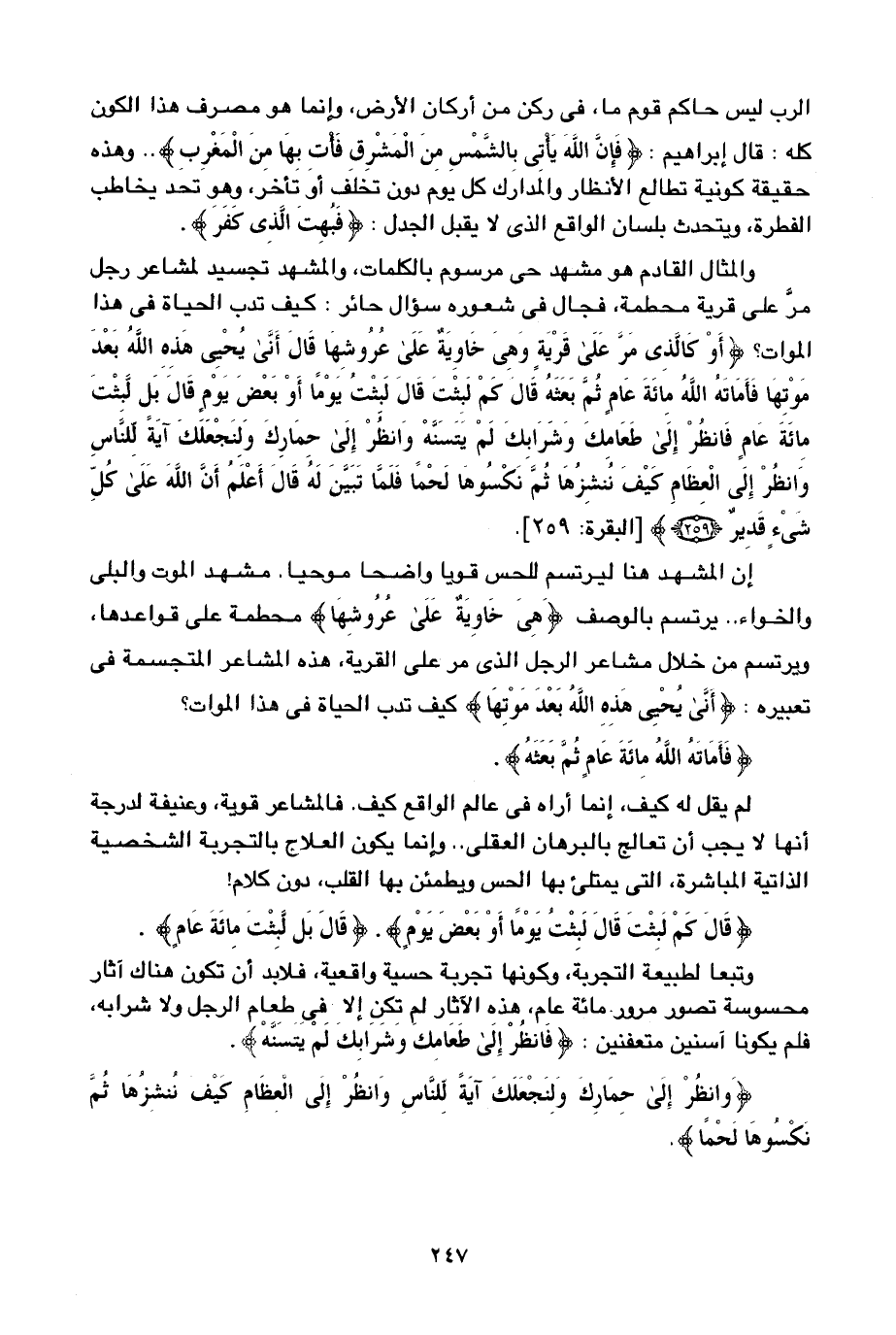 إن المشهد هنا ليرتسم للحس قويا واضحا موحيا، مشهد الموت والبلى والخواء.. يرتسم بالوصف {وَهِيَ خَاوِيَةٌ عَلَى عُرُوشِهَا} محطمة على قواعدها، ويرتسم من خلال مشاعر الرجل الذي مر على القرية، هذه المشاعر المتجسمة في تعبيره: {أَنَّى يُحْيِي هَذِهِ اللَّهُ بَعْدَ مَوْتِهَا} كيف تدب الحياة في هذا الموات؟