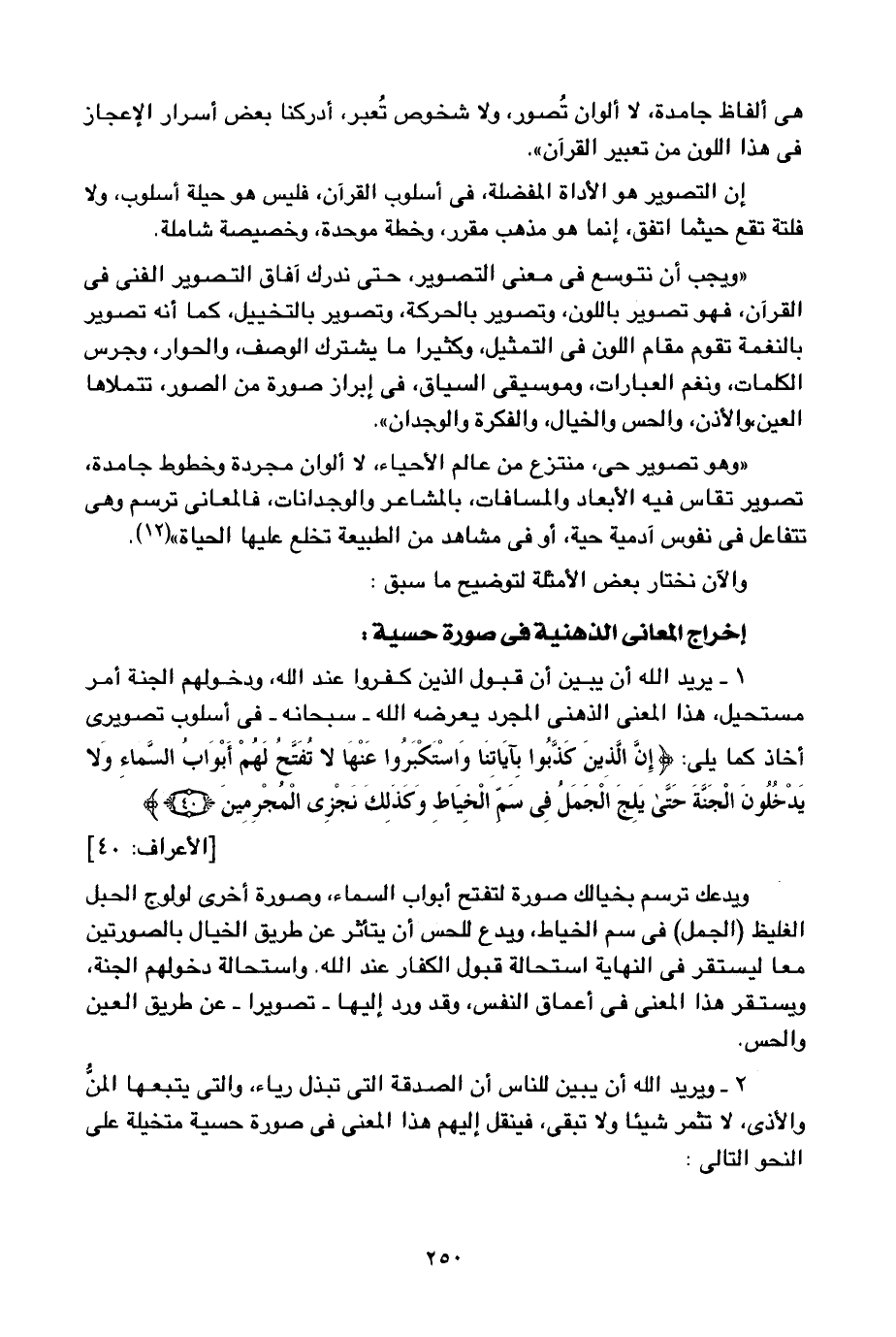 "ويجب أن نتوسع في معنى التصوير، حتى ندرك آفاق التصوير الفني في القرآن، فهو تصوير باللون، وتصوير بالحركة، وتصوير بالتخييل، كما أنه تصوير بالنغمة تقوم مقام اللون في التمثيل، وكثيرا ما يشترك الوصف، والحوار، وجرس الكلمات، ونغم العبارات، وموسيقى السياق، في إبراز صورة من الصور، تتملاها العين، والأذن، والحس والخيال، والفكرة والوجدان".
