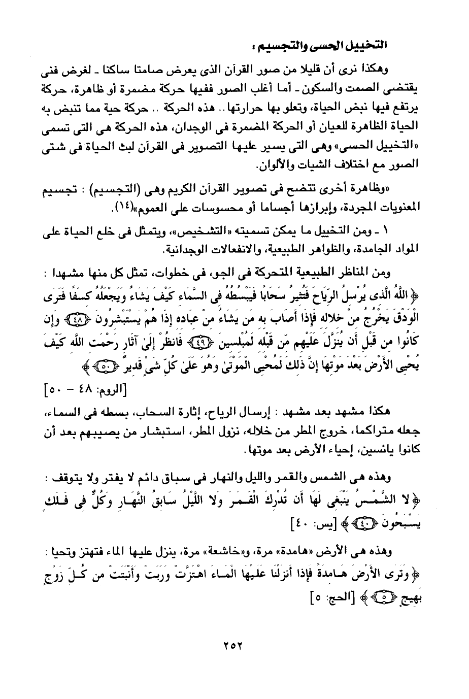 وهكذا نرى أن قليلا من صور القرآن الذي يعرض صامتا ساكنا -لغرض فني يقتضي الصمت والسكون- أما أغلب الصور ففيها حركة مضمرة أو ظاهرة، حركة يرتفع فيها نبض الحياة، وتعلو بها حرارتها.. هذه الحركة.. حركة حية مما تنبض به الحياة الظاهرة للعيان أو الحركة المضمرة في الوجدان، هذه الحركة هي التي تسمى "التخييل الحسي" وهي التي يسير عليها التصوير في القرآن لبث الحياة في شتى الصور مع اختلاف الشيات والألوان.