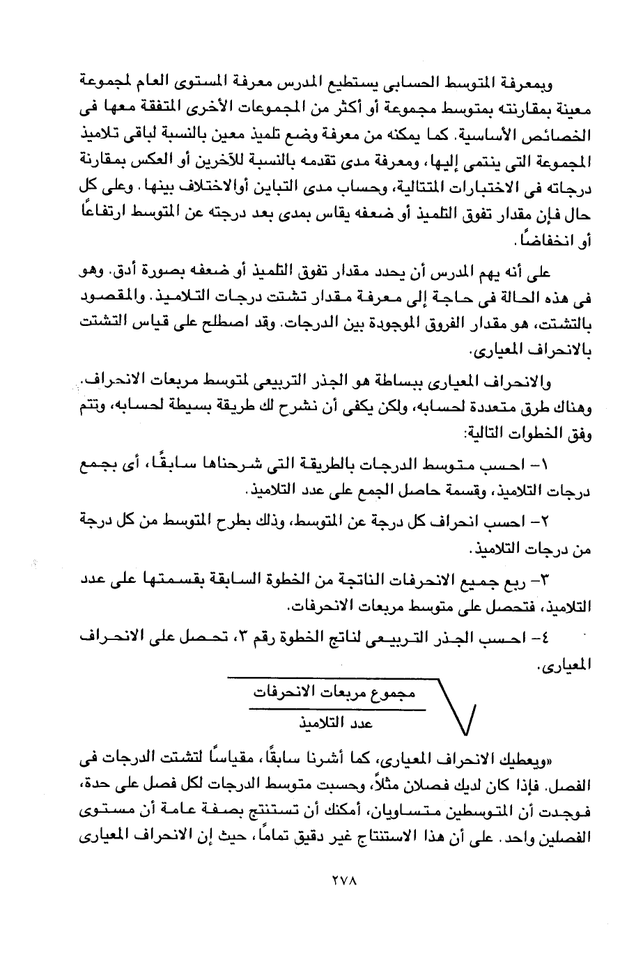 على أنه يهم المدرس أن يحدد مقدار تفوق التلميذ أو ضعفه بصورة أدق، وهو في هذه الحالة في حاجة إلى معرفة مقدار تشتت درجات التلاميذ، والمقصود بالتشتت، هو مقدار الفروق الموجودة بين الدرجات، وقد اصطلح على قياس التشتت بالانحراف المعياري.