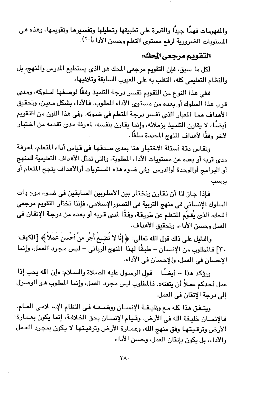 فإذا جاز لنا أن نقارن ونختار بين الأسلوبين السابقين في ضوء موجهات السلوك الإنساني في منهج التربية في التصور الإسلامي، فإننا نختار التقويم مرجعي المحك، الذي يقوم المتعلم عن طريقه، وفقا لمدى قربه أو بعده من درجة الإتقان في العمل وحسن الأداء، وتحقيق الأهداف.