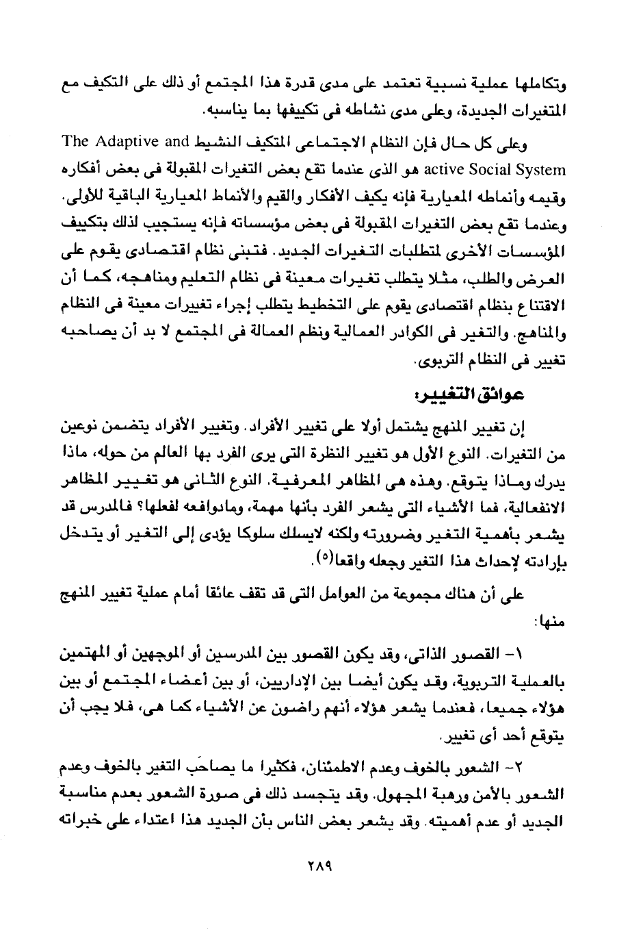 وعلى كل حال فإن النظام الاجتماعي المتكيف النشيط The Adaptive and active Social System هو الذي عندما تقع بعض التغيرات المقبولة في بعض أفكاره وقيمه وأنماطه المعيارية فإنه يكيف الأفكار والقيم والأنماط المعيارية الباقية للأولى، وعندما تقع بعض التغيرات المقبولة في بعض مؤسساته فإنه يستجيب لذلك بتكييف المؤسسات الأخرى لمتطلبات التغيرات الجديدة، فتبني نظاما اقتصاديا يقوم على العرض والطلب، مثلا يتطلب تغيرات معينة في نظام التعليم ومناهجه، كما أن الاقتناع بنظام اقتصادي يقوم على التخطيط يتطلب إجراء تغييرات معينة في النظام والمناهج، والتغير في الكوادر العمالية, ونظم العمالة في المجتمع لا بد أن يصاحبه تغيير في النظام التربوي.