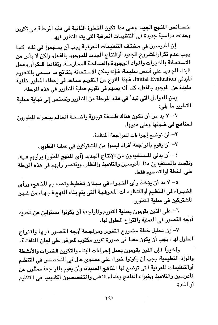 5- لا بد أن يؤخذ رأي الخبراء في ميدان تخطيط وتصميم المناهج، ورأي الخبراء في التنظيم أو التنظيمات المعرفية التي يتم بناء المنهج فيها، من غير المشتركين في عملية التطوير.