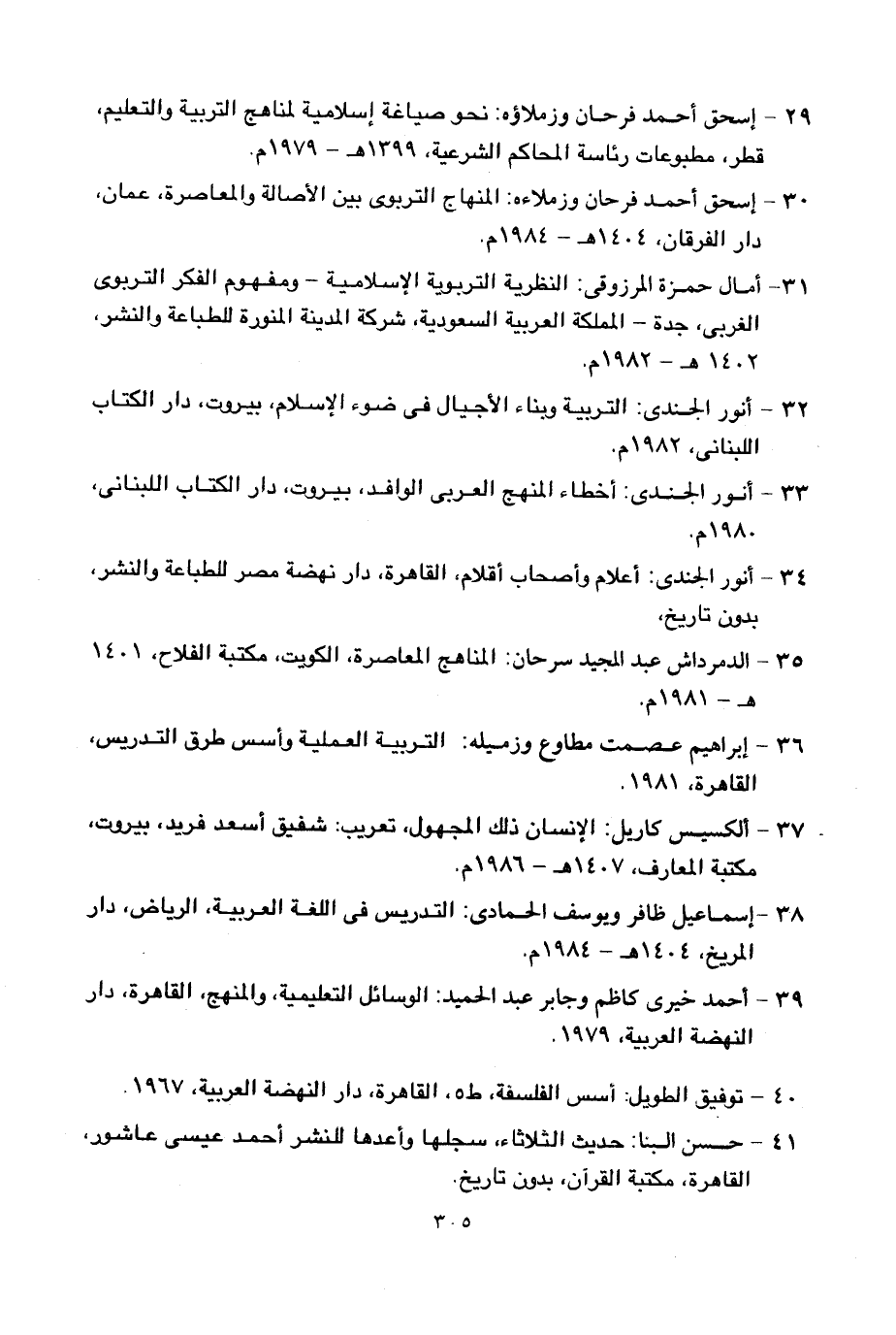 30- إسحاق أحمد فرحان وزملاؤه: المنهاج التربوي بين الأصالة والمعاصرة، عمان، دار الفرقان، 1404هـ-1984م.
