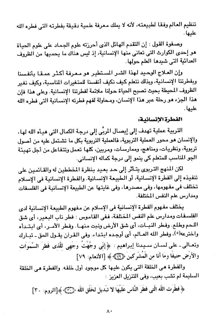 وإن العلاج الوحيد لهذا الشر المستطير هو معرفة أكثر عمقا بأنفسنا وبفطرتنا الإنسانية، وبذلك نتعلم كيف نكيف أنفسنا للمتغيرات المناسبة، وكيف نغير الظروف المحيطة بحيث تصبح الحياة حولنا ملائمة لفطرتنا الإنسانية، وعلى هذا فإن هذا الجزء هو رحلة عبر هذا الإنسان، ومحاولة لفهم فطرته الإنسانية التي فطره الله عليها.