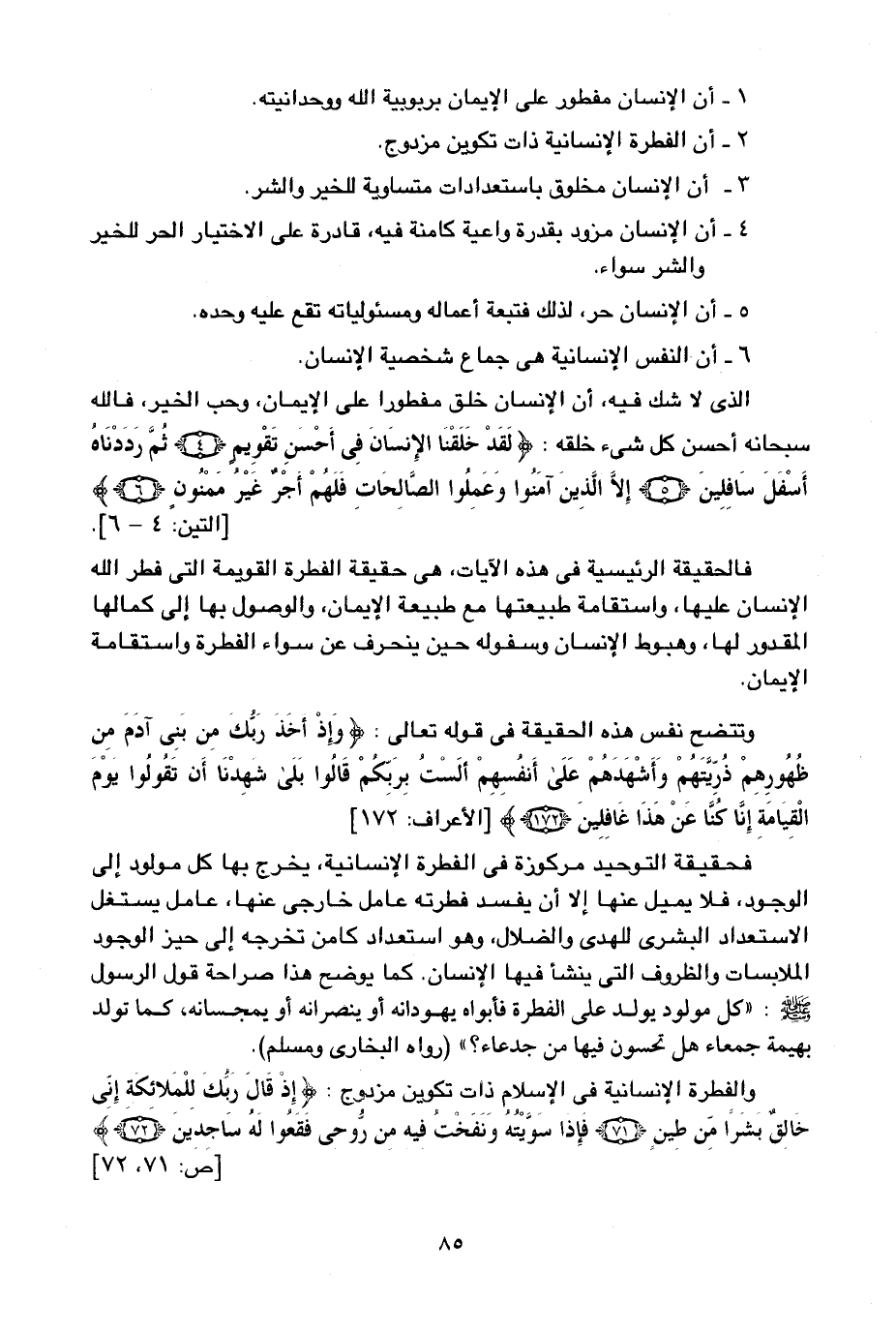 والفطرة الإنسانية في الإسلام ذات تكوين مزودج: {وَإِذْ قَالَ رَبُّكَ لِلْمَلائِكَةِ إِنِّي خَالِقٌ بَشَرًا مِنْ صَلْصَالٍ مِنْ حَمَأٍ مَسْنُونٍ، فَإِذَا سَوَّيْتُهُ وَنَفَخْتُ فِيهِ مِنْ رُوحِي فَقَعُوا لَهُ سَاجِدِينَ} [ص: 71، 72] .