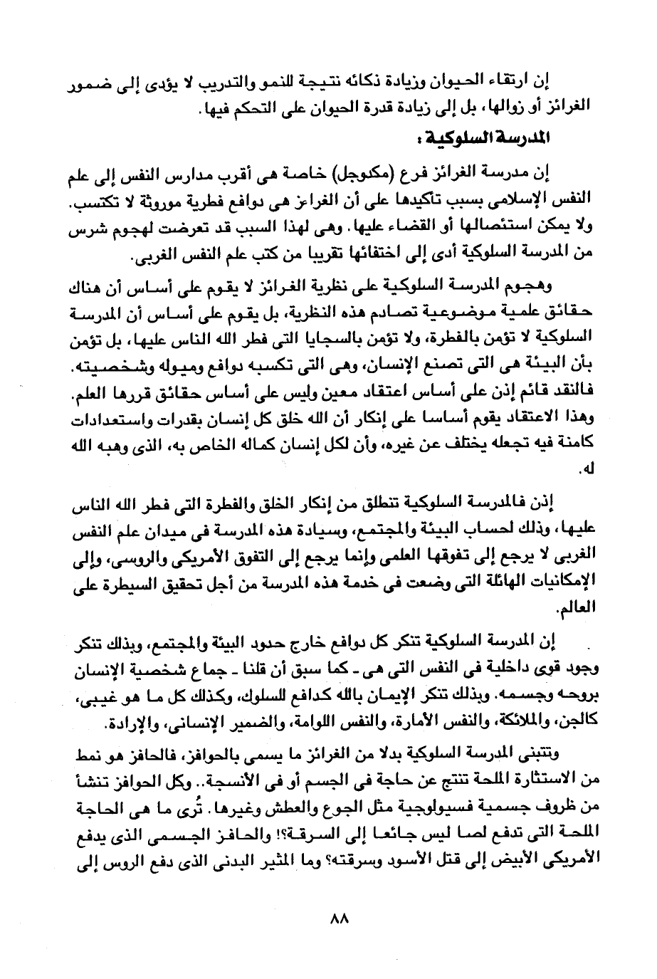 وهجوم المدرسة السلوكية على نظرية الغرائز لا يقوم على أساس أن هناك حقائق علمية موضوعية تصادم هذه النظرية، بل يقوم على أساس أن المدرسة السلوكية لا تؤمن بالفطرة، ولا تؤمن بالسجايا التي فطر الله الناس عليها، بل تؤمن بأن البيئة هي التي تصنع الإنسان، وهي التي تكسبه دوافع وميوله وشخصيته، فالنقد قائم إذن على أساس اعتقاد معين, وليس على أساس حقائق قررها العلم، وهذا الاعتقاد يقوم أساسا على إنكار أن الله خلق كل إنسان بقدرات واستعدادات كامنة فيه تجعله يختلف عن غيره، وأن لكل إنسان كماله الخاص به، الذي وهبه الله له.