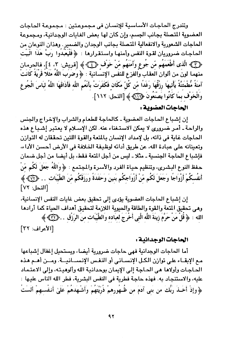 وتندرج الحاجات الأساسية للإنسان في مجموعتين: مجموعة الحاجات العضوية المتصلة بجانب الجسم، وإن كان لها بعض الغايات الوجدانية، ومجموعة الحاجات الشعورية والانفعالية المتصلة بجانب الوجدان والضمير. وهذان النوعان من الحاجات ضروريان لقوة النفس وأمنها واستقرارها: {فَلْيَعْبُدُوا رَبَّ هَذَا الْبَيْتِ، الَّذِي أَطْعَمَهُمْ مِنْ جُوعٍ وَآمَنَهُمْ مِنْ خَوْفٍ} [قريش: 3، 4] ، فالحرمان منهما لون من ألوان العقاب والفزع للنفس الإنسانية: {وَضَرَبَ اللَّهُ مَثَلًا قَرْيَةً كَانَتْ آمِنَةً مُطْمَئِنَّةً يَأْتِيهَا رِزْقُهَا رَغَدًا مِنْ كُلِّ مَكَانٍ فَكَفَرَتْ بِأَنْعُمِ اللَّهِ فَأَذَاقَهَا اللَّهُ لِبَاسَ الْجُوعِ وَالْخَوْفِ بِمَا كَانُوا يَصْنَعُونَ} [النحل: 112] .